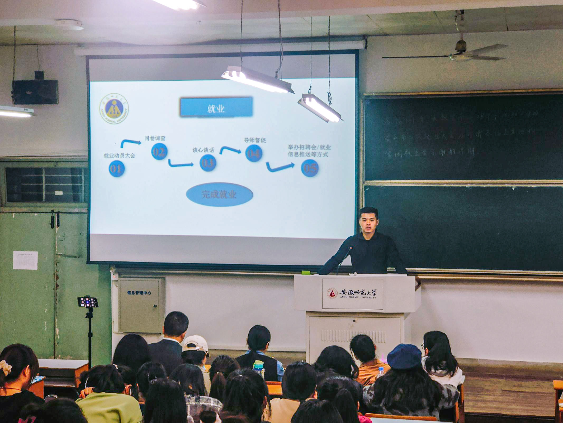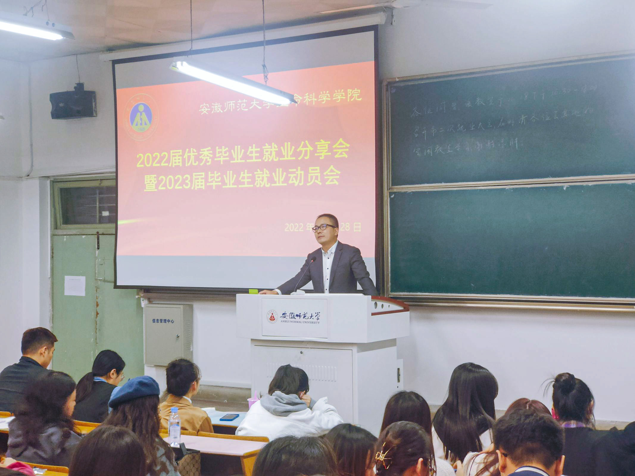 随后,研究生辅导员魏泽坤对上届就业情况以及学院2022届毕业生就业帮扶工作作出总结,详细介绍了安徽省高校征兵工作的新变革及毕业生就业网签流程,同时对2023届毕业研究生就业给予建议:明确目标、多去尝试、集合多方资源、踏实备考。