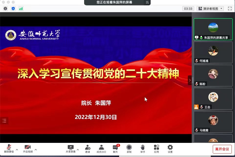12月30日,76net必赢线路检测中心院长朱国萍为2020级生物科学(师范)专业同学讲授“深入学习宣传贯彻党的二十大精神”专题思政课。思政课由辅导员王志主持。