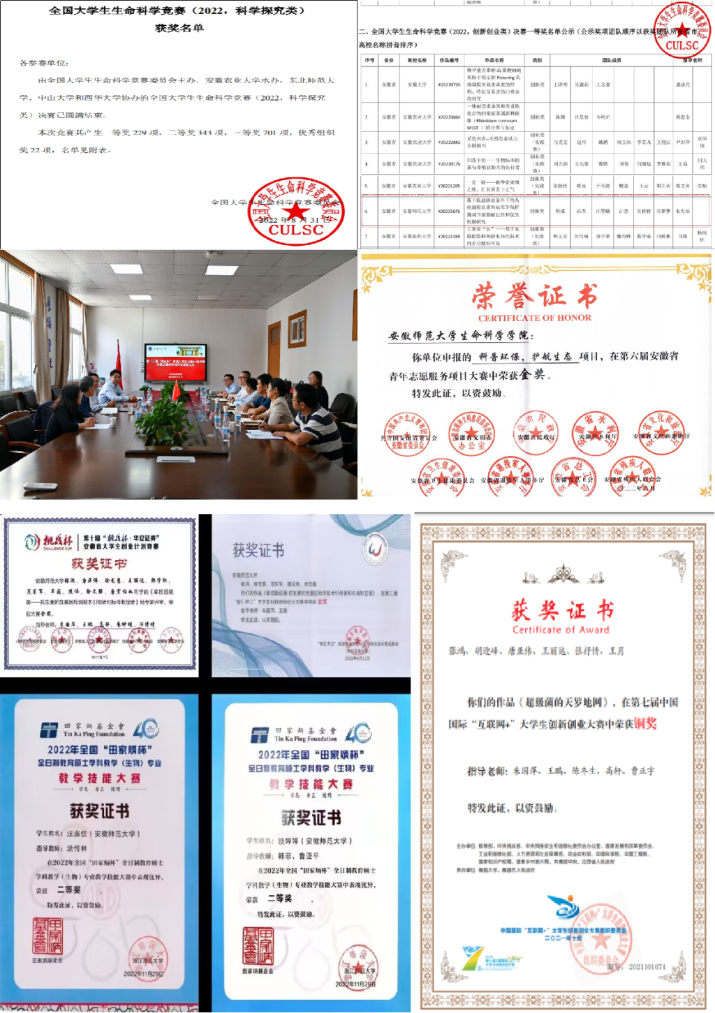 周威等参与作品获得全国大学生生命科学竞赛(2022,创新创业类)一等奖,曹旭婷等参与作品获得全国大学生生命科学竞赛(2022,科学探究类类)一等奖,张鸿等参与作品入围“挑战杯”国赛终审环节,1个项目获得安徽省青年志愿服务大赛金奖,40多件作品获安徽省“互联网+”大赛、大学生生命科学竞赛、大学生食品创新大赛、大学生标本制作大赛奖项。