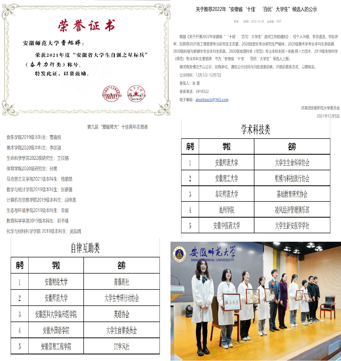 过去的一年里,学院涌现出一批身边的榜样,如“中国大学生自强之星”曹旭婷,入围安徽省“百优”大学生曹旭婷,入围安徽省2022年高校学生“无偿献血先进个人”刘岩路,涂雯等18人获评安徽省优秀毕业生,汪晨曦人获评级别“学生资助宣传大使”暨“乡村振兴助力大使”,500人次获得校级奖励。生科协和考协分别进入安徽省高校联通杯“活力社团”学术科技类和自律互助类TOP5榜单,19级生科1班获评校“十佳班集体”。