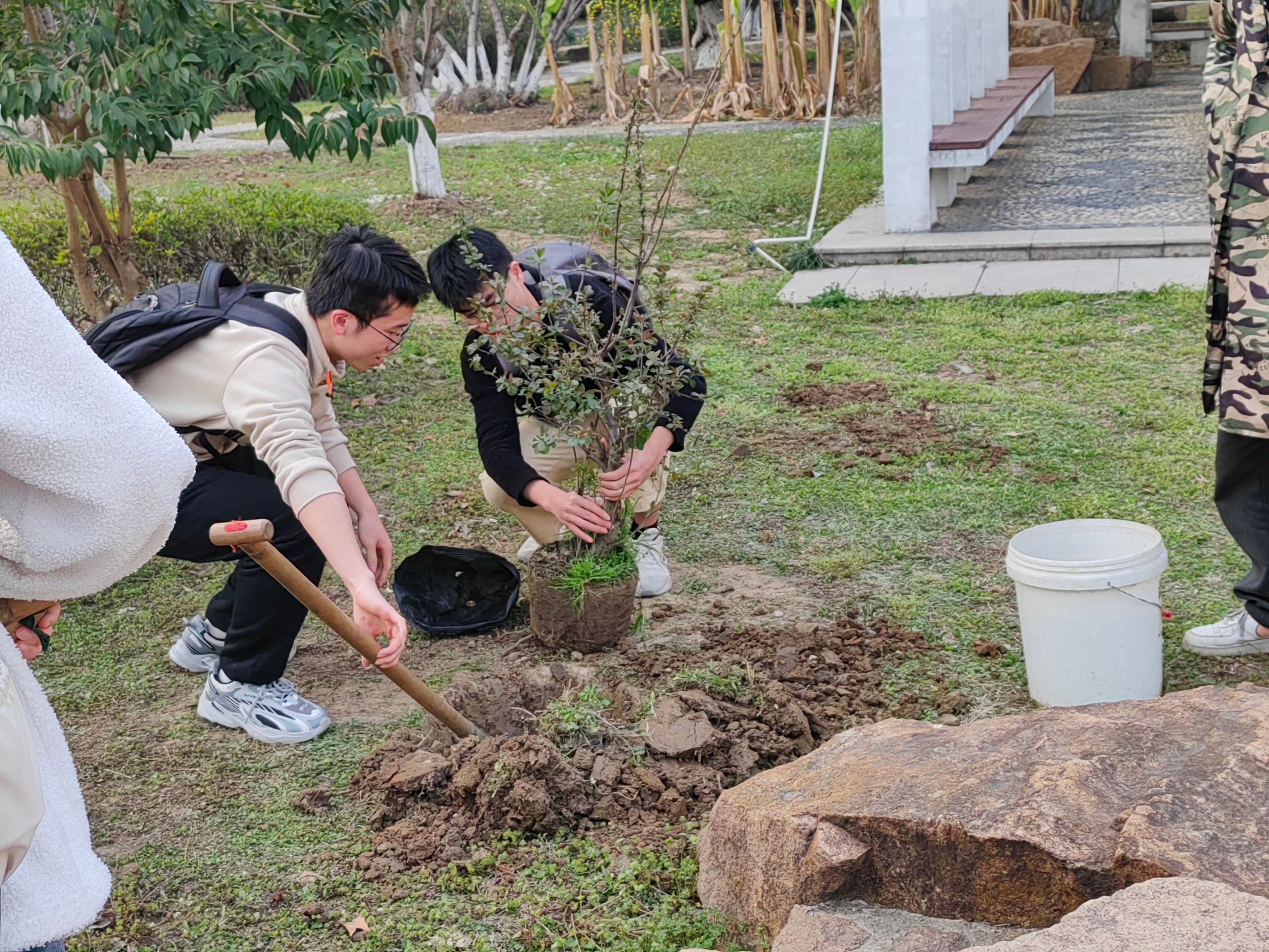 同学们将小树苗运送到栽培地,大家分工合作,挥锹铲土、扶苗埋坑、取水浇灌……植树现场,大家三五人一组,互相配合,每个步骤都做得认真细致,热闹的场面温馨而快乐。不久,在同学们的辛勤劳动下,树苗便“亭亭玉立”在沃土之上。大家围绕着自己种下的树苗,满怀欣喜地留下对未来的美好愿景的期待。活动践行“两山”理念,增强了同学们的绿化意识与环保意识,为地球“充值”绿色,为守护自然生态出一份力量。