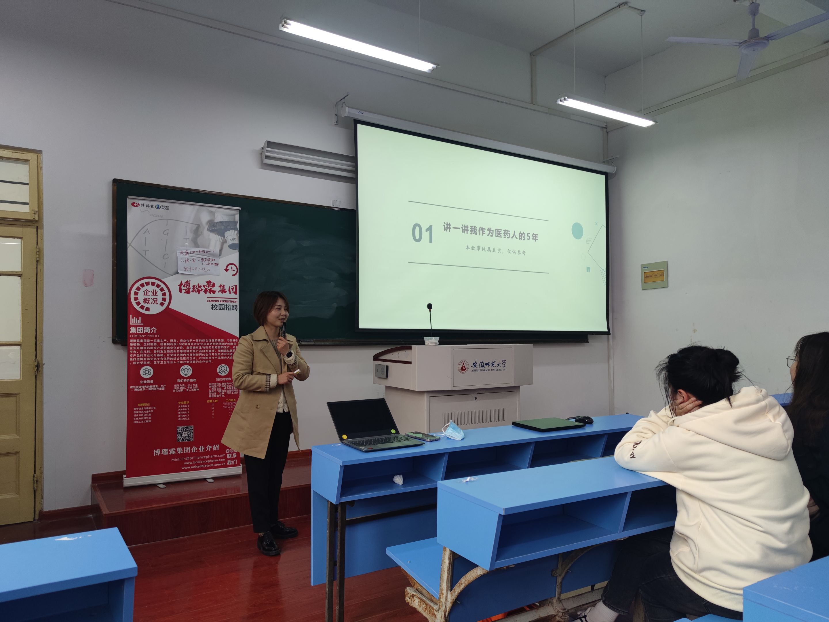 下午,博瑞霖集团地区经理我院2013级生物技术专业校友吴婷婷介绍了身为医药人毕业五年来的成长与收获,并开展专项招聘。