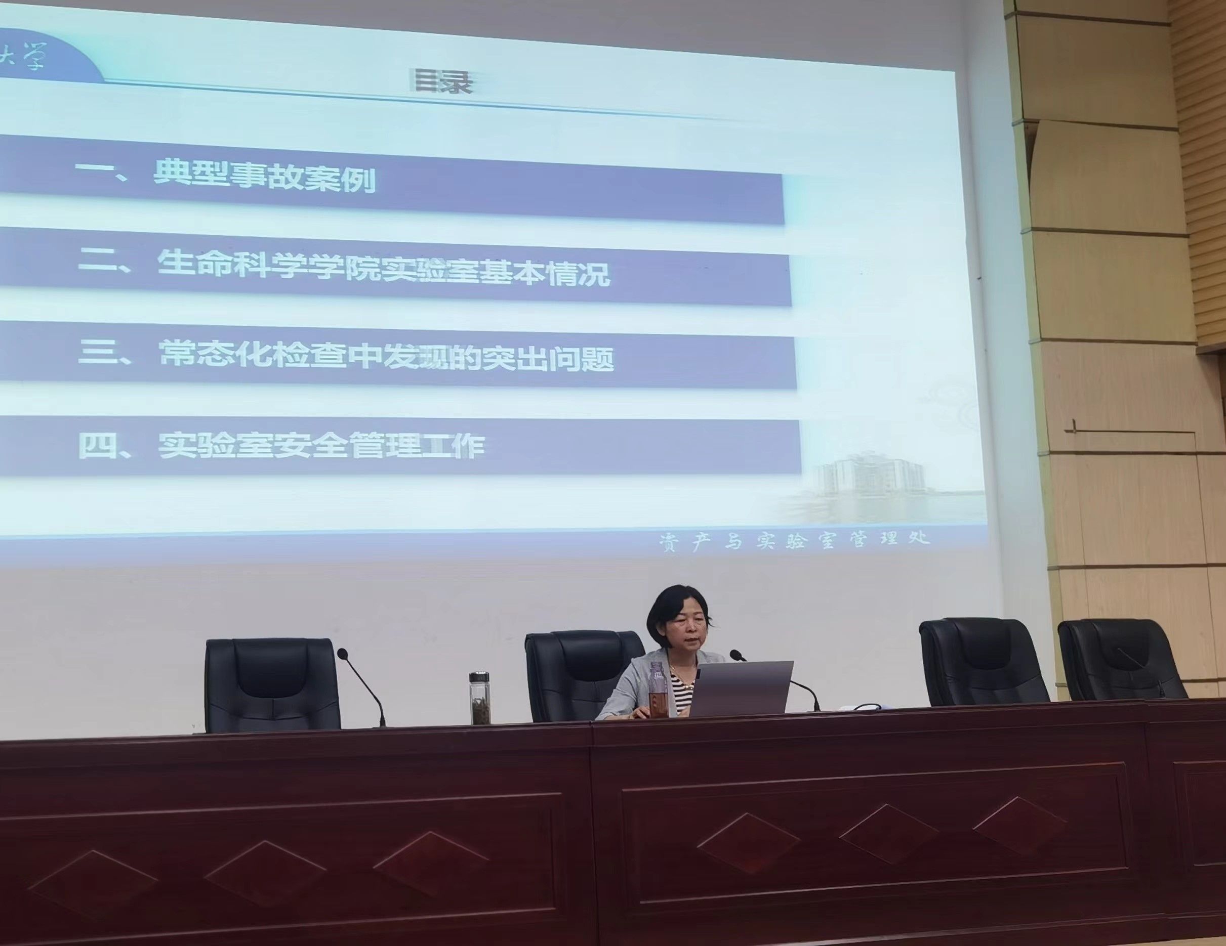 会议邀请了校资产与实验室管理处副处长刘桂云研究员为师生做了一场实验室安全管理培训讲座。她从典型事故案例分析、生科院实验室基本情况、常态化检查中发现的突出问题和实验室安全管理工作等四个方面入手讲解了实验室存在的安全隐患和处理方法。她着重强调了建立实验室安全管理制度体系、压实实验室安全责任体系、落实实验室安全管理基本要求、加强实验室安全专项管理等四个方面的工作在实验室安全管理中的重要作用。