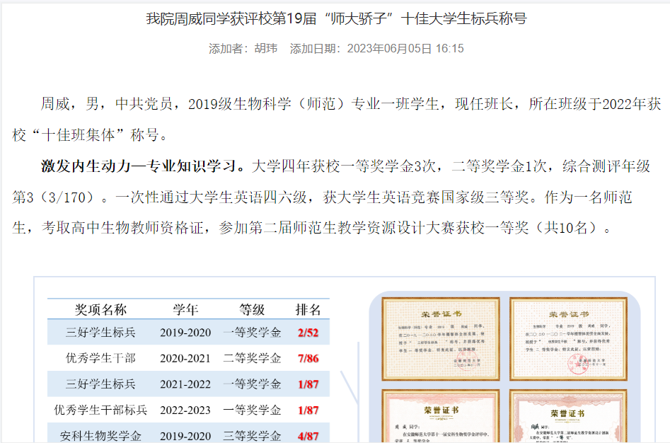 为集中展示学院立德树人实际成效,生科院以毕业季为契机,开展优秀毕业生先进典型系列宣传活动,集中选树了以19级生物科学(师范)周威同学为代表一批优秀生科学子。通过“师大骄子”“省级优秀毕业生”“校级优秀毕业生”“生命骄子”评选宣传,鼓励同学们向身边学长学姐学习,矢志拼搏奋斗,走好自己的大学道路。