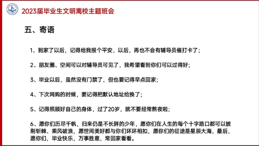 课堂上师语谆谆,在“目标与选择”、“责任与担当”、“宽容与感恩”三个方面与毕业生们交流,鼓励毕业生响应时代号召,脚踏实地,淬炼成长、成就未来。毕业班辅导员对安全离校、就业考研、党团关系转移等事项进行了详细讲解和叮嘱强调。