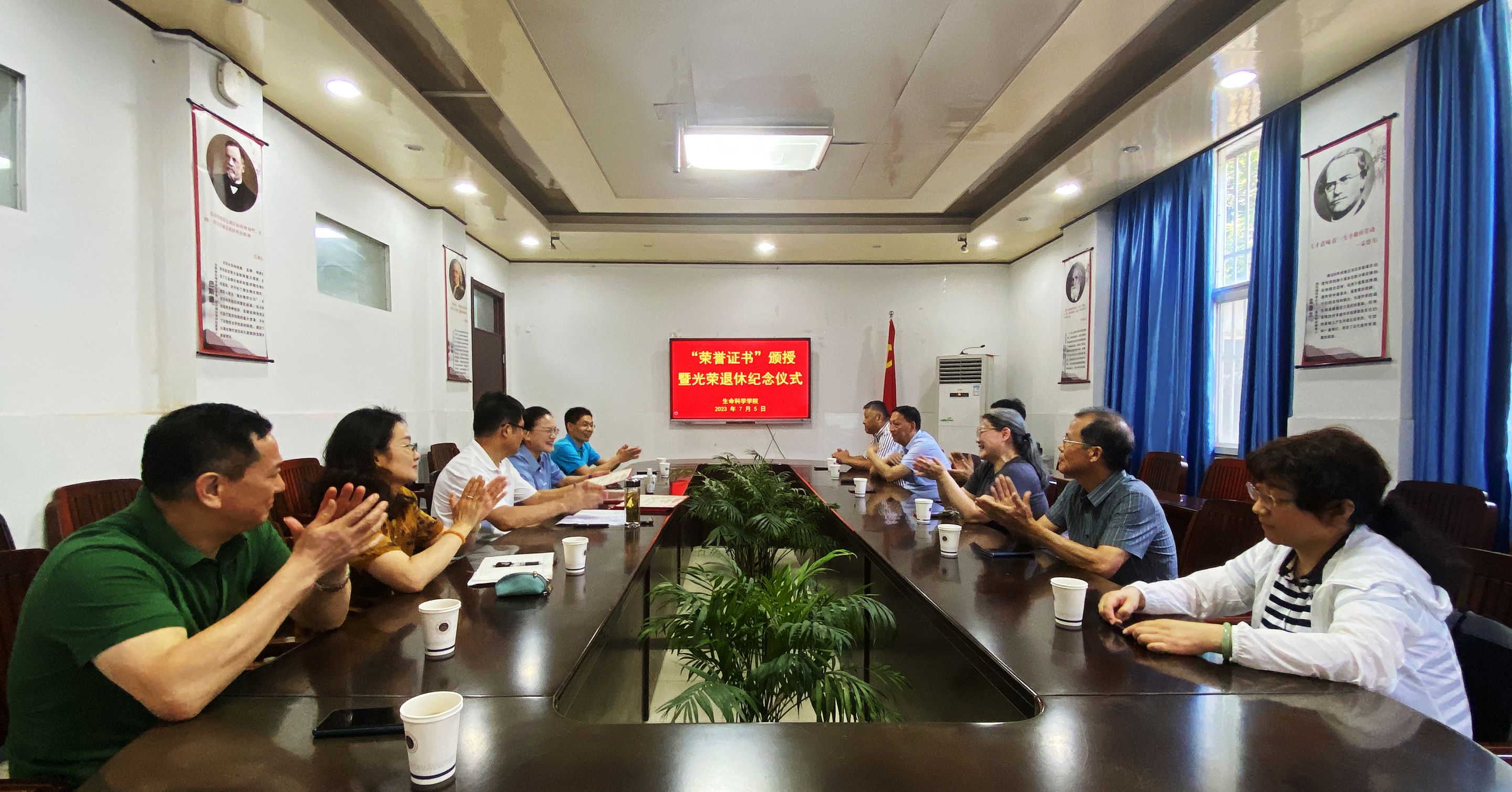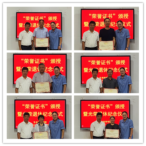 本网讯(生科院)7月5日,76net必赢线路检测中心教职工光荣退休仪式在学院会议室隆重举行。学院院长朱国萍、学院党委副书记汪倩倩、副院长王立龙出席仪式,6名退休教职工到场参加。仪式由学院党委书记蒋学波主持。