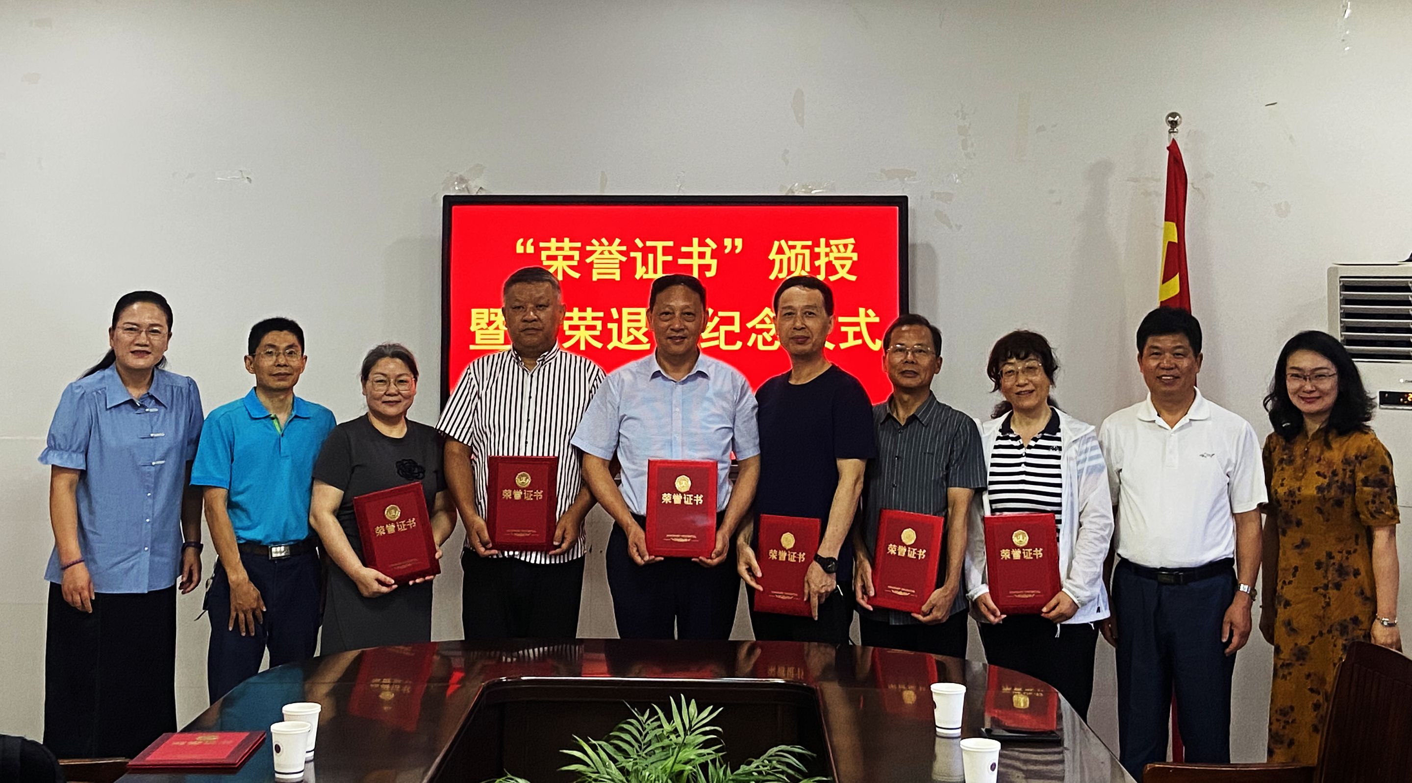 仪式上,蒋学波和朱国萍分别向退休教职工颁发荣誉证书,赠送礼品并合影留念。