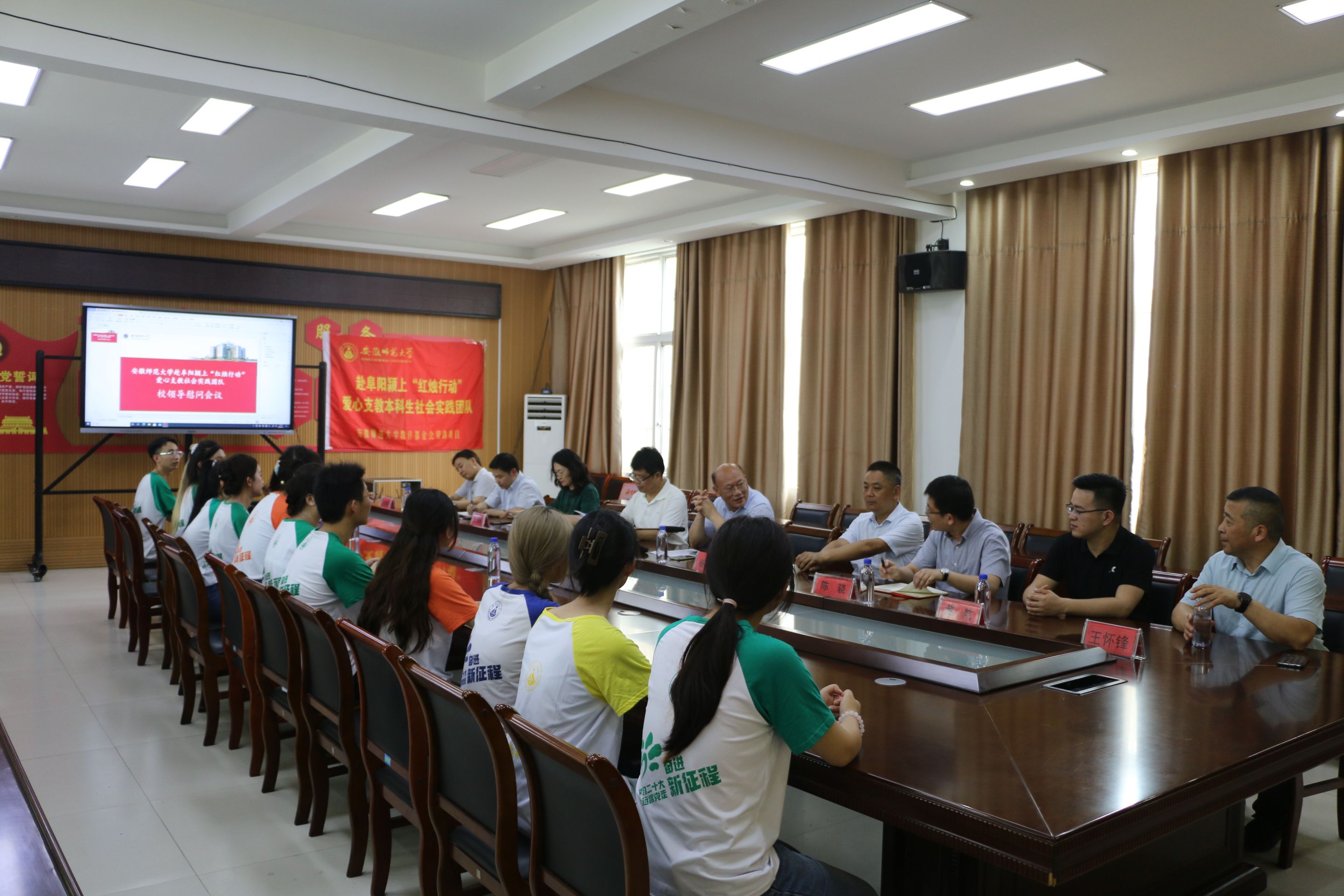 在认真听取实践团队的工作汇报和师生的发言后,周新发高度评价了“红烛行动”爱心支教社会实践团队的实践活动。他指出,暑期社会实践是是大学生受教育、长才干、作贡献的有效载体,是青年学生在实践中学真知、悟真谛、长真才的生动课堂,是青年学生用脚步丈量祖国大地,用眼睛发现中国精神,用耳朵倾听人民呼声,用内心感应时代脉搏的具体行动,是青年学生奉献祖国、奉献人民的重要舞台。当前全国上下深入开展学习贯彻习近平新时代中国特色社会主义思想主题教育,广大同学通过社会实践了解祖国巨大成就、激发爱国热情,是一种很好的爱党爱国爱中国特色社会主义新时代的教育形式。刚才听了同学们的发言,充分表明同学们在暑期“三下乡”社会实践活动中的态度是端正的、活动是丰富的、服务是卖力的、团队是和谐的、收效是显著的。他对参与社会实践的同学提出了三点希望:一是认真做好活动的梳理和总结。在总结中思考、在总结中提高,通过“第三课堂”获得“第一课堂”以外的成长,进一步锤炼品质、培养人格、陶冶情操、提升境界。为将来走向教师岗位成长为一名优秀的人民教师奠定良好的基础。二是坚定正确的理想和信念。同学们要发扬优良传统,自觉确立奋发成才的奋斗目标,在服务基层的生动实践中受教育、长才干、做贡献,勇作担当民族复兴大任的时代新人。三是树立正确的世界观、人生观和价值观。正视困难,乐观向上,在克服困难中成长、在解决矛盾中成才,要胸怀大志,刻苦学习,将来以出色的才华和创造性的工作担负起建设家乡、服务安徽、报效祖国的重任。