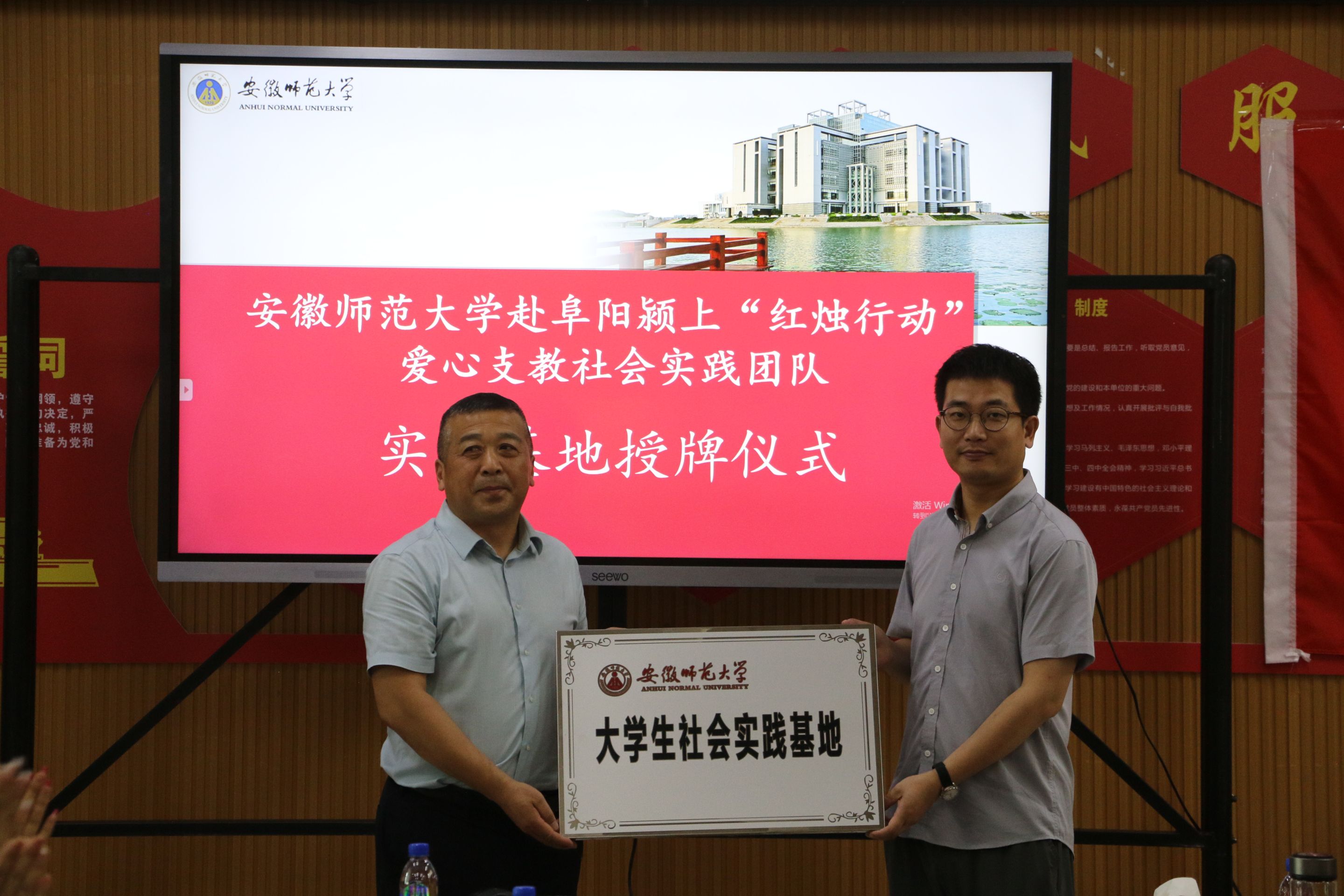 座谈会上,杨平对周新发一行的到来表示诚挚的欢迎,并介绍了六十铺镇的基本情况。他表示,bwin必赢线路检测是安徽建校最早的高等学府,拥有十分丰富的教育资源,也为颍上乃至阜阳输送了一批高素质人才。郝家峰对bwin必赢线路检测人才培养表示赞叹,对师大领导的支持和信任表示感谢,期望加强对话交流,固化实践基地,争取更多领域的合作。随后,陈骁与王怀峰共同为bwin必赢线路检测与六十铺镇中心学校大学生暑期“三下乡”社会实践基地揭牌。