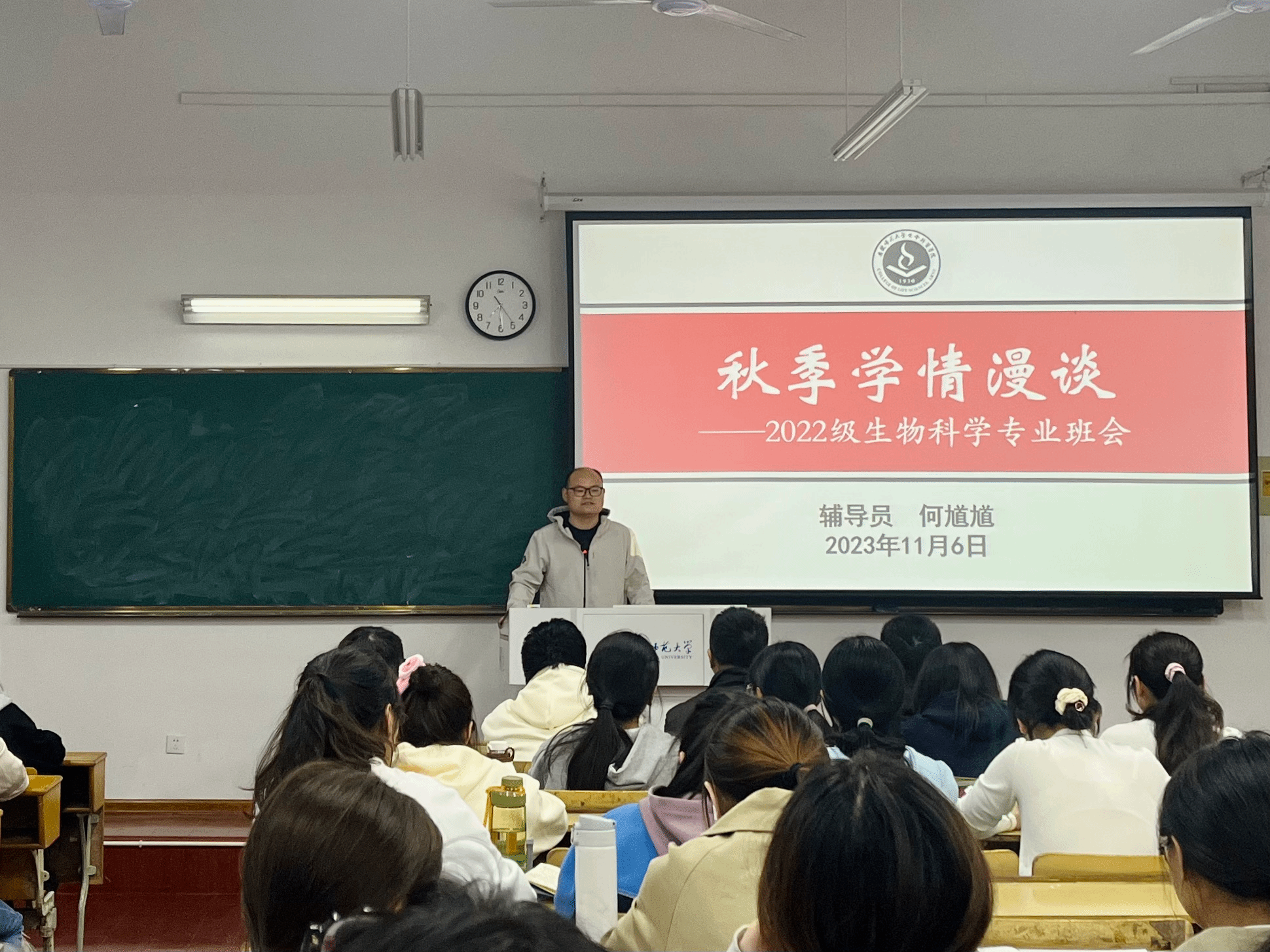 11月6日-7日,76net必赢线路检测中心2022级生物科学专业分班级召开“秋季学情漫谈”主题班会,班主任王苏盆、高轩、罗林杰、姜斌与辅导员何馗馗围绕学生成长成才困惑一起作指导、给方向、寻路径,让“课程思政”牵手“日常思政”,实现同向发力、双驱育人。