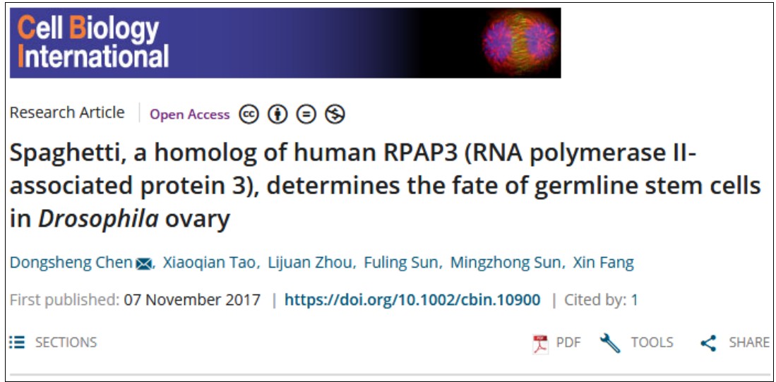 果蝇spag(spaghetti)基因编码人类RNA聚合酶II结合蛋白3(RNA polymerase II-associated protein 3, RPAP3)的同源蛋白。spag基因高度保守,参与了包括基底膜形成、生物节律调控和多种细胞内结构的装配等生物学过程。spag基因缺失突变导致果蝇胚胎致死,课题组利用RNA干扰(RNA interfering)技术和细胞嵌合体分析(cell clone assay)等技术揭示了spag基因内源性调控干细胞维持的新功能。同时,还从遗传学角度揭示了spag与hsp83基因存在相互作用,spag与hsp83基因的双突变体出现了果蝇生殖干细胞加剧丢失的表型,后续的生化机制将有待于进一步探究。此项工作以安师大生科院为唯一作者单位,研究生陶小倩承担了论文的主要工作。该成果发表在近期《Cell Biology International》上:“Spaghetti, a homolog of human RPAP3 (RNA polymerase II‐associated protein 3), determines the fate of germline stem cells in Drosophila ovary. Cell Biology International, 2018, 42(2018): 769-780.(SCI,四区)”。