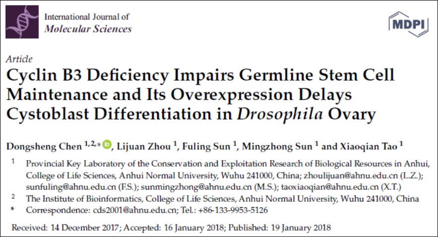 周期蛋白B3(Cyclin B3)是调节细胞周期的进程重要因子之一,Cyclin B3、Cyclin A和Cyclin B共同调控有丝分裂期中期向后期的转变。陈冬生副教授课题组研究表明,cycB3基因内源性调节果蝇卵巢生殖干细胞的命运,cycB3基因突变导致GSC的自我更新和分化失衡,促使GSC提前走向分化。此外,cycB3依赖“BMP/Dpp-bam”信号通路发挥功能,在GSC中,cycB3基因不参与bam基因的沉默,通过抑制GSC的分化使其维持干性;在卵巢包囊母细胞(Cystoblast)中,cycB3基因位于bam的上游,通过抑制bam蛋白的活性而抑制CB的分化。该成果以安师大生科院为唯一作者单位,研究生周利娟承担了论文的主要工作。此工作发表在今年《International Journal of Molecular Sciences》上:“Cyclin B3 Deficiency Impairs Germline Stem Cell Maintenance and Its Overexpression Delays Cystoblast Differentiation in Drosophila Ovary. International Journal of Molecular Sciences, 2018, 19 (1): 298-316.(SCI,三区)”。