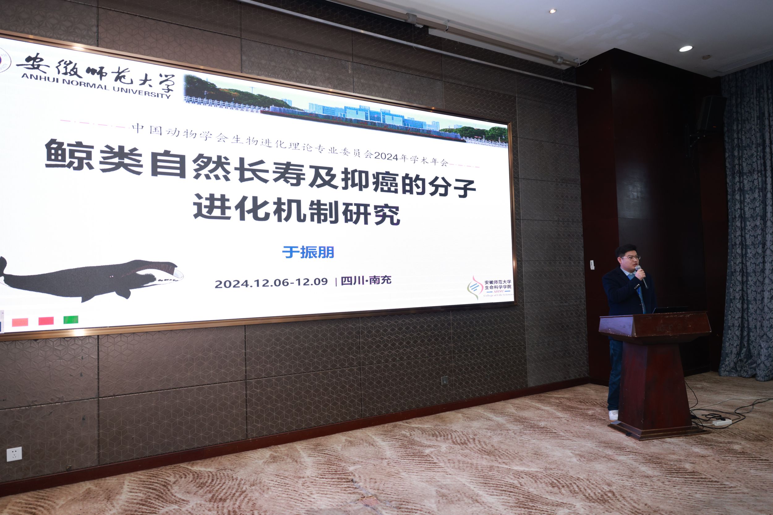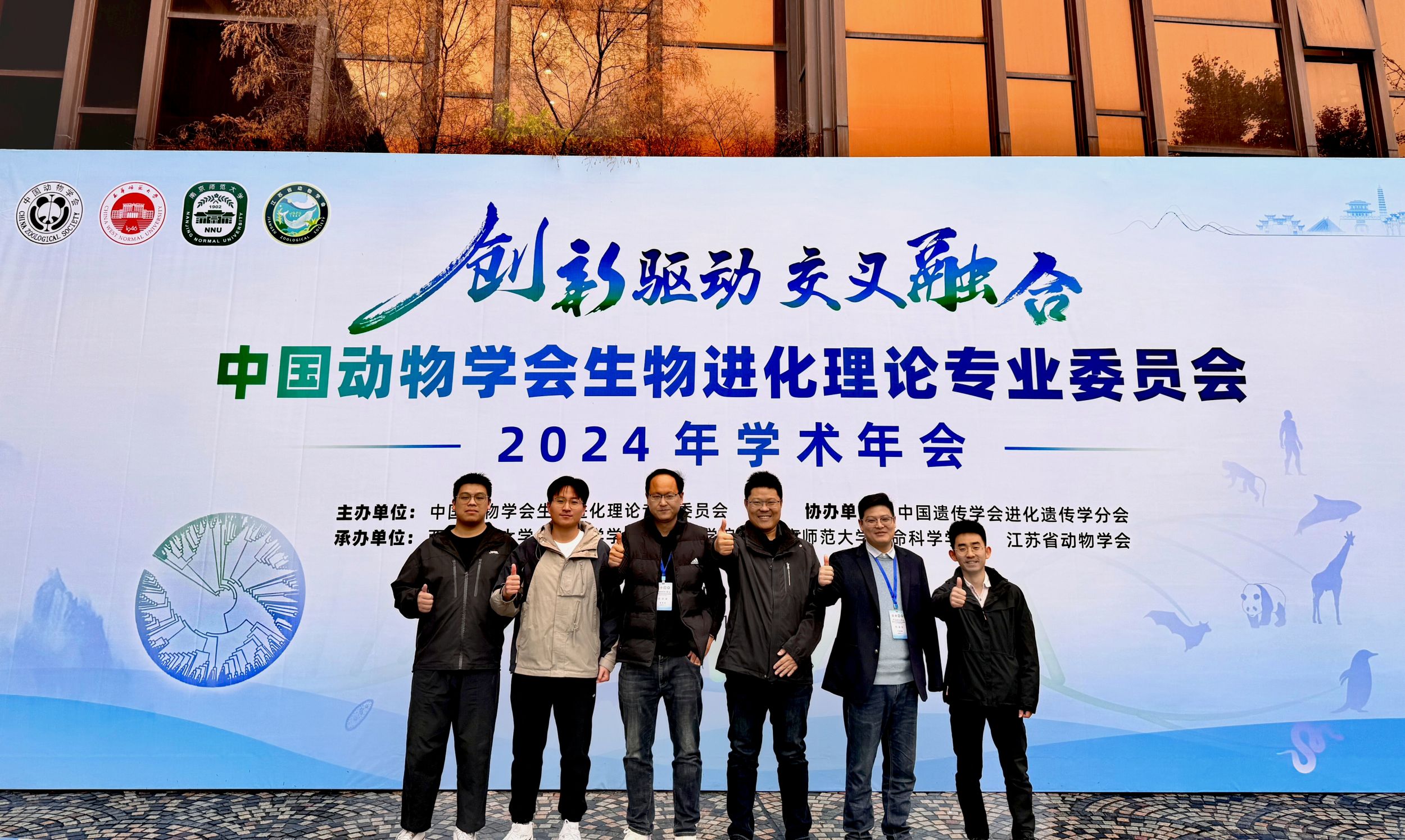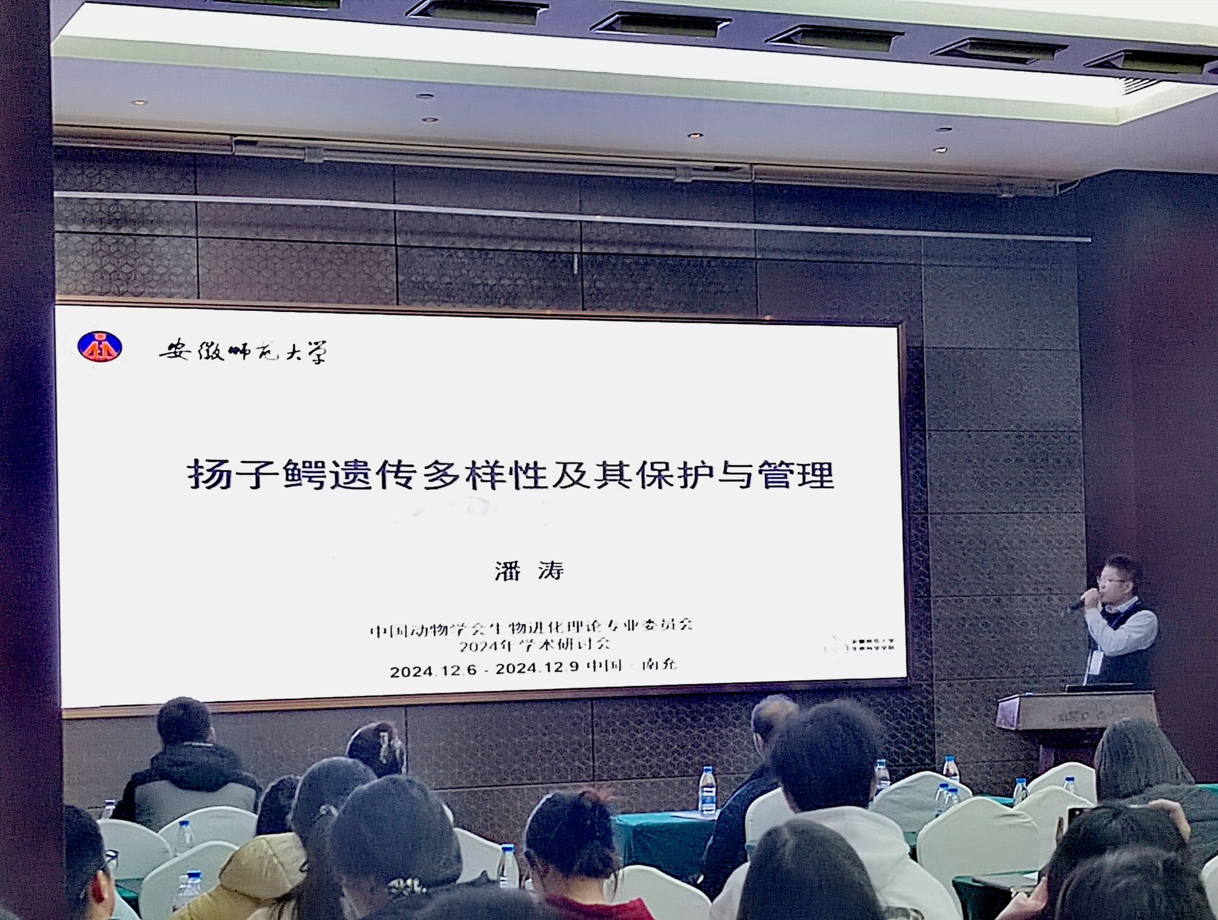 本次会议以“创新驱动、交叉融合”为主题,采用特邀报告、青年大会报告、专题报告及展览展示等多种形式进行。会议共七场大会特邀报告和六场青年大会报告,设四个专题报告会场,涵盖84场学术报告。与会人员围绕遗传多样性及其保护与管理、生物进化历史与系统发育重建、适应性进化与多样性形成机制、学科交叉与新技术应用等关键科学问题展开深入交流,探讨生物进化领域的最新研究进展。大会邀请了多位学术领军人物做特邀报告,包括中国科学院昆明动物研究所张亚平院士、江西农业大学/中国科学院动物研究所魏辅文院士、中国科学院水生生物研究所何舜平研究员、中国科学院古脊椎动物与人类研究所付巧妹研究员、南京师范大学钟伯坚教授、西华师范大学廖文波教授以及中国科学院昆明动物研究所赖仞研究员。我院动物多样性保护与进化遗传学团队潘涛副教授、聂海涛特任副教授、青年教师于振朋、博士生高玉林等师生共6人应邀参加了本次学术会议。会上,潘涛与于振朋老师分别以“扬子鳄遗传多样性及其保护与管理”和“鲸类自然长寿及抑癌的分子进化机制研究”为题进行学术报告。两场报告引发了与会人员的密切关注,加深了同行对bwin必赢线路检测在相关研究领域的了解,促进了彼此间的学术交流。