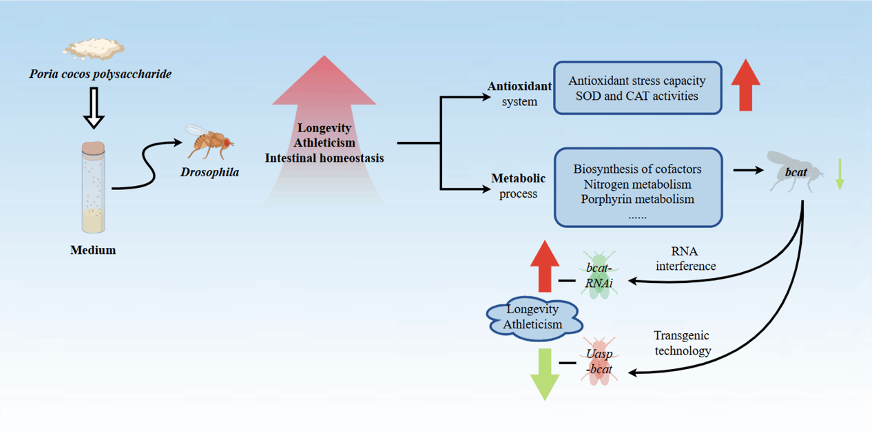 茯苓多糖(Poria cocos polysaccharides,PCP)是传统中药材茯苓的主要成分,具有免疫调节和抗氧化作用等多种生物活性。衰老课题组联合药物研究组(负责人:杜冬生特任副教授)对茯苓多糖的结构进行了表征,并以果蝇为模型研究了PCP延缓衰老的作用和机制。结果表明,饮食补充PCP显著延长了果蝇寿命,提高了运动能力,改善肠道功能障碍,缓解了胃肠酸碱失衡,防止了肠干细胞(ISCs)的过度增殖。此外,PCP提高了果蝇体内抗氧化酶SOD和CAT的活性,提升了果蝇的抗氧化能力。RNA-Seq表明,补充PCP导致638个基因的差异表达。KEGG分析表明,PCP显著影响了支链氨基酸合成通路,体现在支链氨基酸转移酶编码基因(Bcat)的表达显著下调。Bcat基因敲除显著延长了果蝇的寿命,而Bcat过表达缩短了寿命。有趣的是,在Bcat过表达的背景下,添加PCP可以挽救果蝇的寿命。