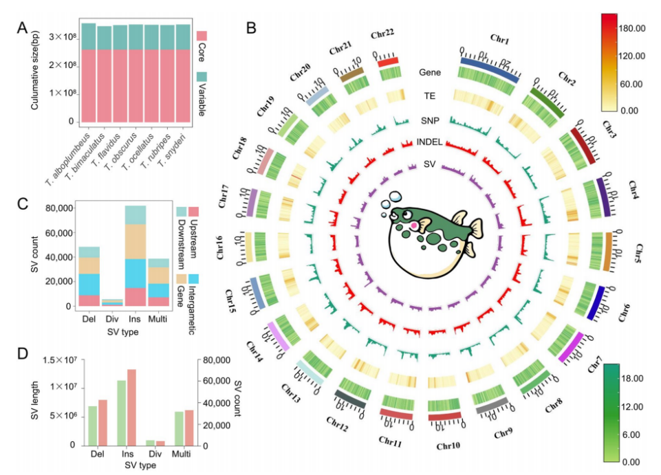 东方鲀俗称河豚,是一类具有重要经济价值的鱼类。然而,由于过度捕捞和栖息地破坏等因素,该属多个物种的野生种群正面临严峻的生存威胁。部分濒危种类如暗纹东方鲀(Takifugu obscurus)已被列入保护名录。为深入理解东方鲀的遗传多样性与进化动态,研究团队基于7种东方鲀的基因组数据,构建了图形泛基因组和基于基因的泛基因组。研究发现,在28,085个同源基因群中,仅有57.3%为所有个体共享的核心基因,其余基因存在显著的“存在-缺失变异”(PAV),表明东方鲀基因组具有高度多样性。通过分析160个东方鲀个体的基因组数据,团队鉴定出超过2000万个单核苷酸多态性(SNPs)、4,606,141个插入缺失变异(Indels)和152,200个结构变异(SVs),为东方鲀的遗传研究提供了丰富分子生物学资源。