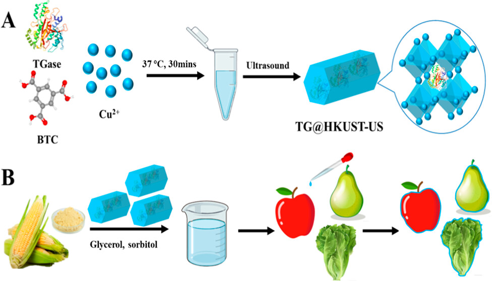 传统石油基食品包装带来了严重的环境挑战,为此,转谷氨酰胺酶(TG)等生物交联剂被探索用于开发新型环保包装膜,但天然TG酶存在稳定性差、难以回收利用等问题,限制了其在实际生产中的大规模应用。本课题组首次利用超声波辅助生物矿化法,将TG酶固定于铜基金属有机框架材料(HKUST-1)中,成功构建了高效稳定的TG@HKUST-US复合催化剂,并进一步将TG@HKUST-US应用于玉米醇溶蛋白(Zein)基食品包装膜的制备中,系统评估了其保鲜性能。固定化酶表现出增强的相对酶活性,并展现出优异的温度、pH和有机溶剂稳定性及卓越的重复利用性;进一步利用其制备的玉米保鲜膜能显著减缓果蔬水分流失,苹果、梨和生菜的重量损失率分别降低41.5%、34.1%和29.5%,保鲜效果显著优于未处理组及其他对照组;并且铜离子迁移量(<1 ppm)远低于国际安全标准(世界卫生组织为31.5 μM即2 ppm,美国环境保护署允许浓度限值1.3 ppm。),此项研究成果为食品保鲜工业领域的深入开发与应用提供了坚实的理论依据与科学支撑。
