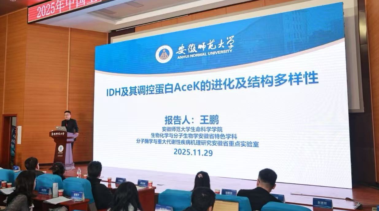 王鹏围绕“IDH及其调控蛋白AceK的进化及结构多样性”这一主题,介绍了课题组近年来取得研究成果。课题组通过系统进化分析新发现了几类新型异柠檬酸脱氢酶(IDH),综合运用酶学分析、结构解析、功能验证等方法,全面揭示了新型IDH蛋白的功能演化机制。课题组还对IDH的调控蛋白异柠檬酸脱氢酶激酶/磷酸酶(AceK)做了系统研究,完善了AceK蛋白家族,发现了该蛋白家族功能异化的机制,并介绍了AceK蛋白作为药物设计靶点相关研究进展,这些研究为分子酶学领域提供了研究范式。