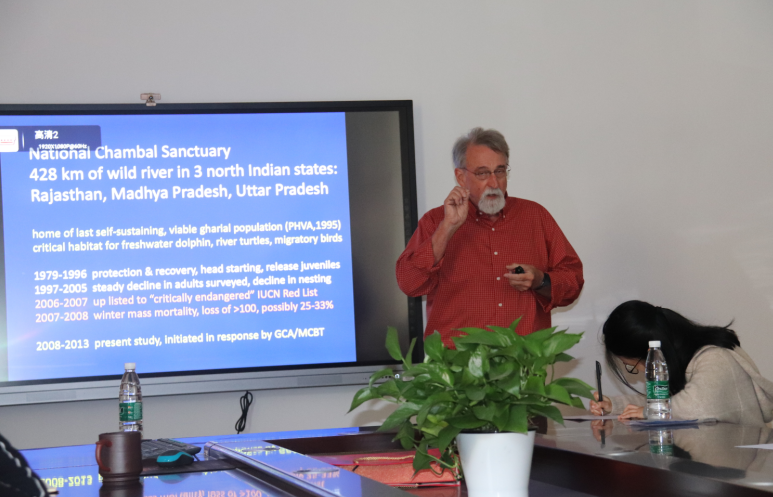 2019年11月1日-4日,世界鳄类专家组成员(Crocodile Specialist Group)美国北达科他州立大学Jeffrey William Lang教授受我院吴孝兵教授的邀请,访问生科院鳄类研究实验室。11月1日上午,在学院会议室作了题为《Gharials on Chambal in north India: past, present, & future 》的学术报告。报告会由我院院长吴孝兵教授主持,学院相关专业的教师和研究生聆听了报告。