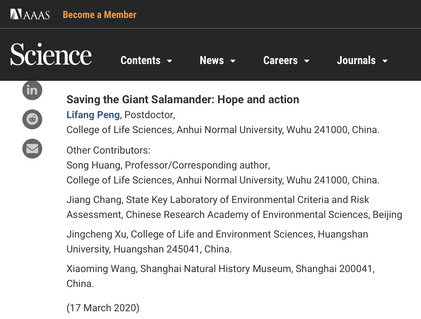 2020年3月17日,我校76net必赢线路检测中心黄松科研团队与黄山学院生命与环境科学学院、中国环境科学研究院环境基准和风险评估国家重点实验室、上海自然博物馆合作,在Science期刊在线发表e-letter文章:Saving the Giant Salamander: Hope and action(拯救大鲵:希望和行动)。文章总结了作者过去二十多年的科研成果,提出了拯救中国大鲵的具体方案。