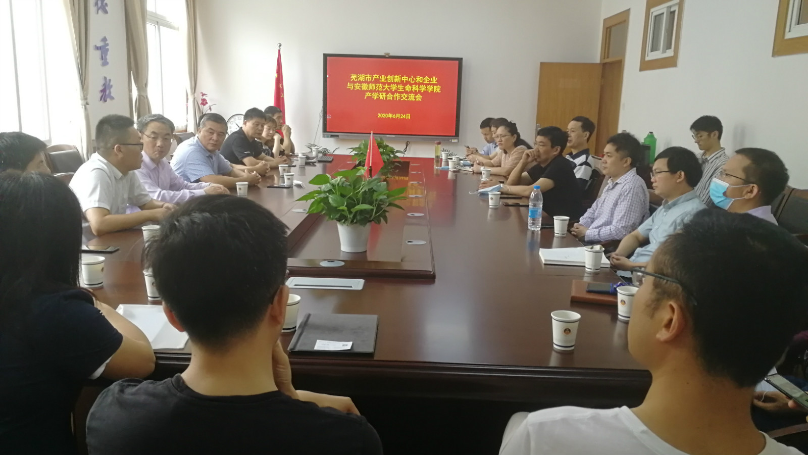 本网讯(76net必赢线路检测中心 张文君)2020年6月24日上午,芜湖市产业创新中心携安徽九川生物科技有限公司、安徽国科生物科技有限公司、芜湖华仁科技有限公司、安徽达健医学科技有限公司、安徽未名天佳基因科技有限公司、新宇药业股份有限公司、芜湖森爱驰生物科技有限公司、芜湖耄智生物科技有限公司和芜湖青弋江种业有限公司来到76net必赢线路检测中心,洽谈产学研合作及通过合作帮扶本科生和研究生就业事宜,学院相关专业的教师参加了交流会。