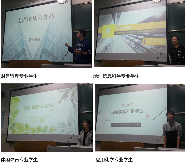 今年下半年,教务处根据教育部相关文件精神,对校通识课进行了全面梳理,并且强调在未来要大力建设校通识课。《基因密码——预见未来的自己》就是由朱国萍教授带领自己的科研团队成员,为全校本科生开设的一门将基因科学知识科普化的新校通识课程。本课程旨在通过基因科学及其相关领域的最新前沿动态,拓展学生的知识领域,学会综合交叉不同专业的知识,激发学生对自然科学的探索欲和学习积极性,进而感受自然科学的魅力,培养学生的观察、分析和理解能力,促进学生德才兼备,适应社会的发展。来自生物技术、生物科学、生物制药专业以及汉语国际教育、汉语言文学、新闻学、舞蹈表演、会计学、思想政治教育、运动训练、法学、投资学、城乡规划、物流管理、历史学、摄影、音乐学、心理学、教育学、工艺美术、经济学、美术学、应用化学、光电信息科学与工程、环境科学、数学与应用数学、计算机科学与技术等非生物专业的共17个学院、57个专业的300名学生完成了课程学习,并结合自己的理解和观点对基因科学的很多热点问题进行了汇报演讲。