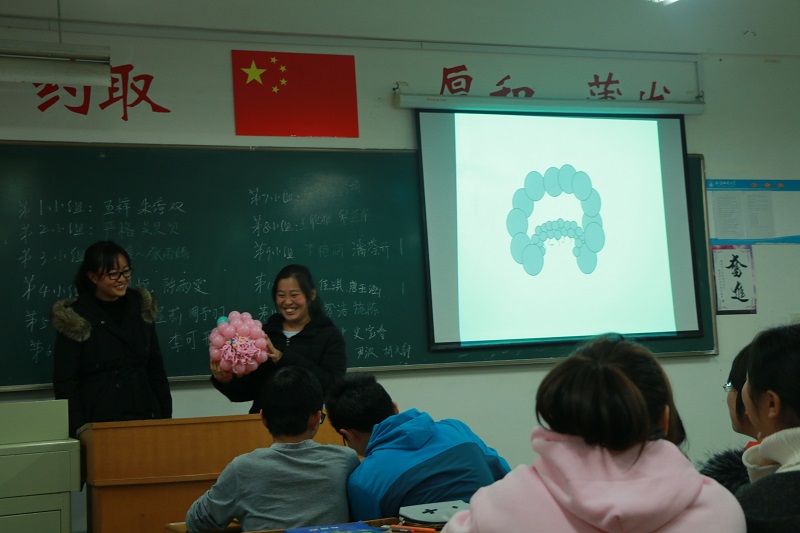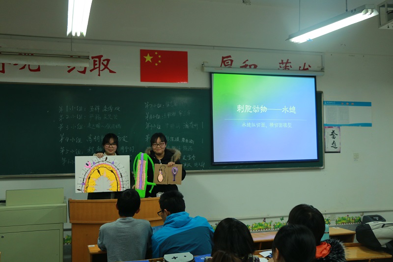 本次活动涉及到的教学模型涵盖原生动物到节肢动物等各门动物的主要结构,既有动物结构的静态模型,也有环节动物的血液循环过程、后肾管代谢废物排出过程等的动态模型。在授课老师宣布汇报次序及评分标准后,第一组同学登台展示了他们制作的绿眼虫以及草履虫的模型,并配上了精彩的讲解,令大家耳目一新。同学们见仁见智,将看起来很复杂的图形用简易的材料制造出相应的模型,让很难理解的蚯蚓的血液循环过程、后肾管代谢废物排出过程等用动画展现出来。立体的动物模型加深了我们对抽象的知识点的理解,尤其是第三小组展示的水螅的纵横切面的模型,真的令同学们赞叹不已,纷纷给予好评。昆虫口器模型的展示也是十分精彩,他们给同学们介绍时条理清晰,制作出的模型也精益求精。活动过程中,温老师不时与同学们交流心得并指出不足之处,大家都受益匪浅。最后赵暖暖和张雨嫣同学的作品“刺胞动物水螅的纵横切面”、郭晓蕾和李可邢同学的作品“环毛蚓的后肾管及链状神经系统”分获一等、二等奖项。