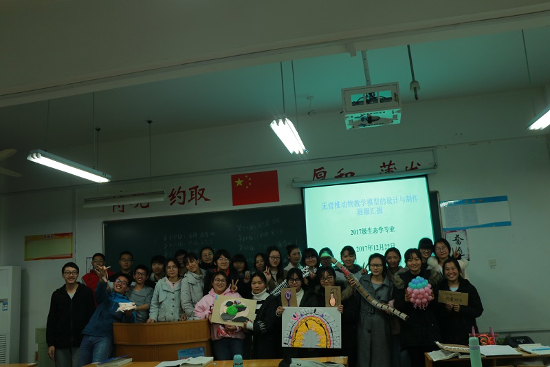 2017年12月22日下午,我院2017级生态学专业在田楼8305教室举行了无脊椎动物教学模型的设计与制作的班级汇报及评比活动。全班28位同学分成13个小组依次登台汇报,各小组以《动物学》授课老师温新利副教授制定的评分细则为标准,对各组同学制作的模型进行了打分和获奖等次的评比。