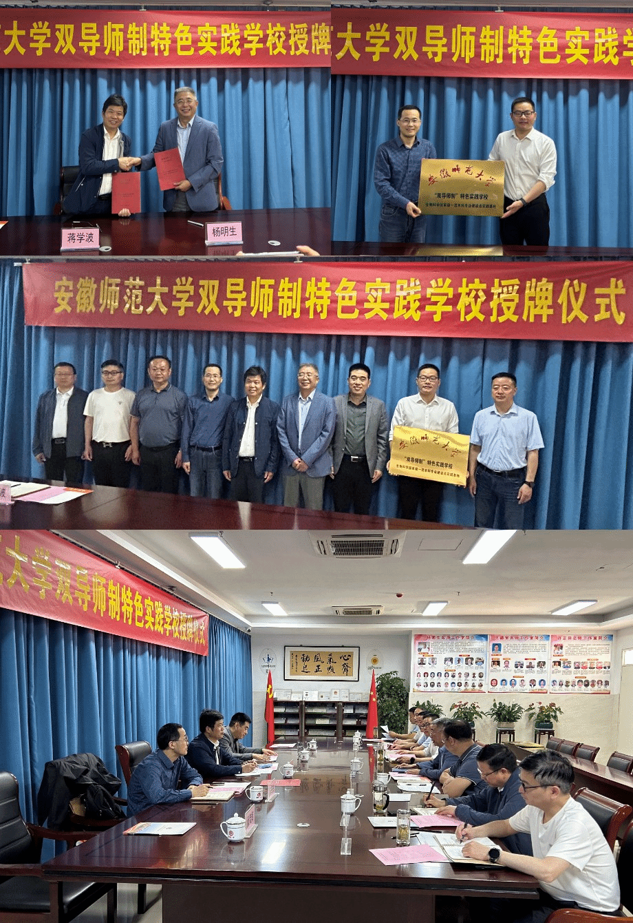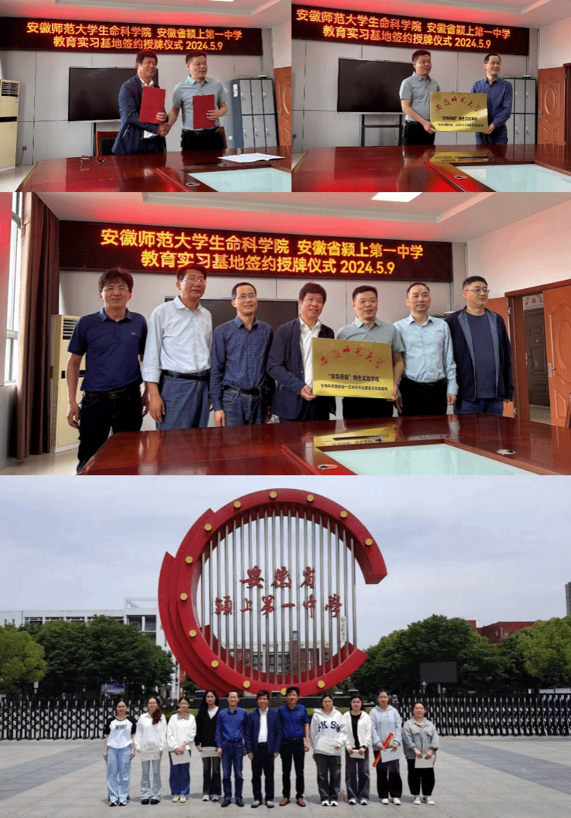 5月8-9日,76net必赢线路检测中心党委书记蒋学波、副院长陈冬生一行走访了霍邱一中、颍上一中两所中学,与两所中学签署了师范专业共建实习基地协议,举行了“bwin必赢线路检测双导师制特色实践学校”授牌仪式;亲切看望了正在两所中学进行教育实习的2021级生物科学(师范)专业实习生,对中学教育实习进行了实地调研。