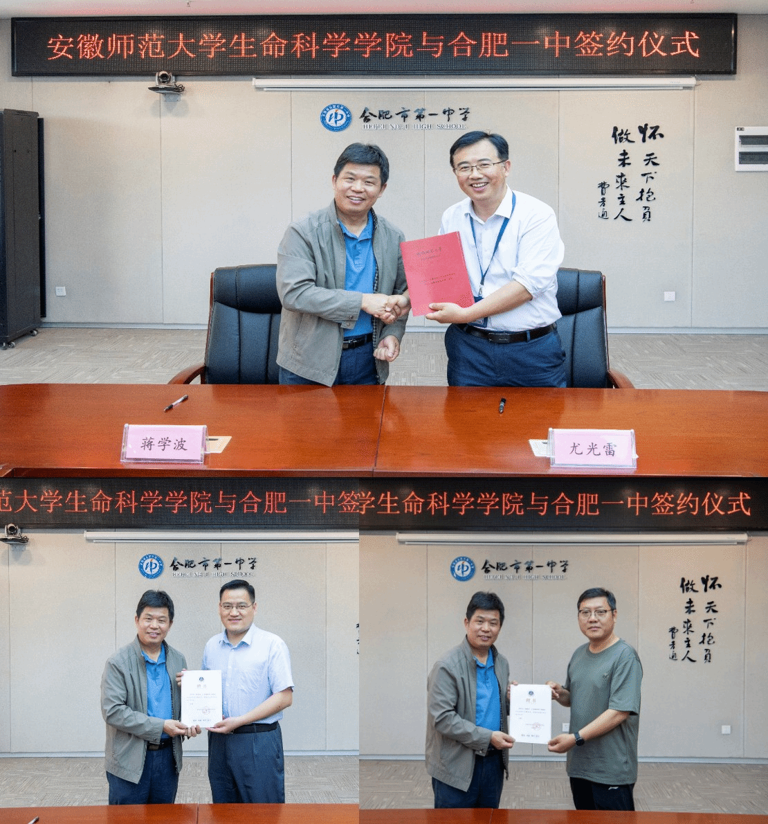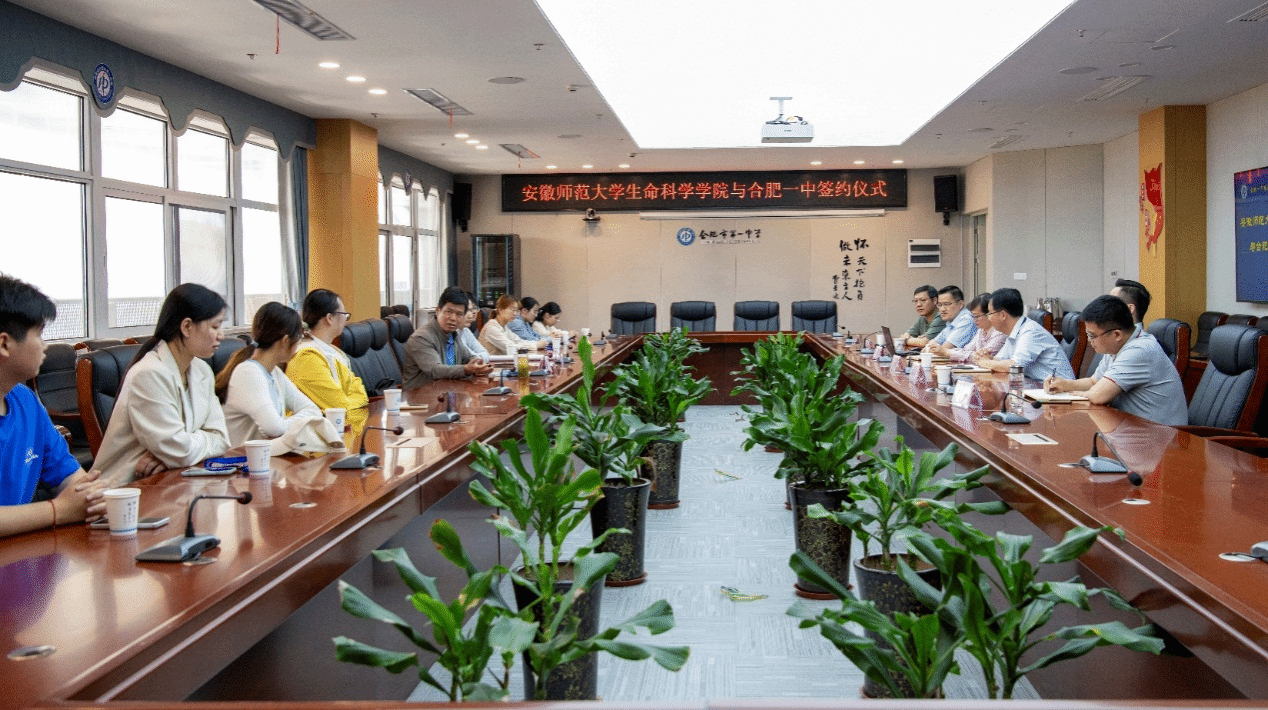 5月16日,76net必赢线路检测中心党委书记蒋学波、专业教师张亚一行前往合肥一中,双方签署了共建生物科学(师范)专业教育实习基地协议,给中学指导老师颁发了教育实习“双导师”聘书,并与2021级生物科学师范专业实习生进行了亲切交流。