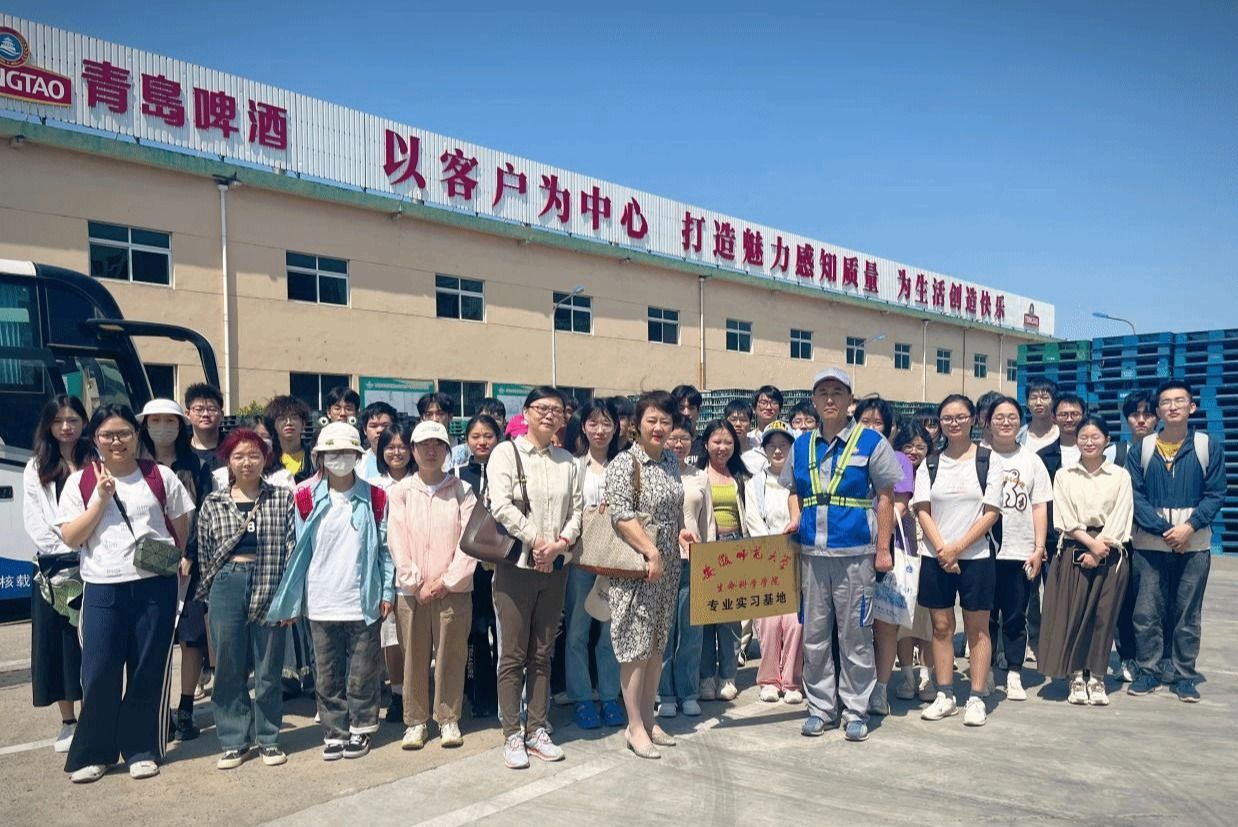 青岛啤酒(马鞍山)有限公司苗磊部长带领大家参观了解青岛啤酒企业,介绍青岛啤酒的创立以及当前的产品类型,随后参观了青岛啤酒的酿造流程、现代化的生产线、先进的酿造技术和一系列生产设备。同学们亲眼见证了从麦芽到啤酒的整个生产过程,深入了解啤酒的酿造工艺。在结束啤酒生产线参观后,师生一同观看了青岛啤酒企业宣传视频,了解啤酒文化。