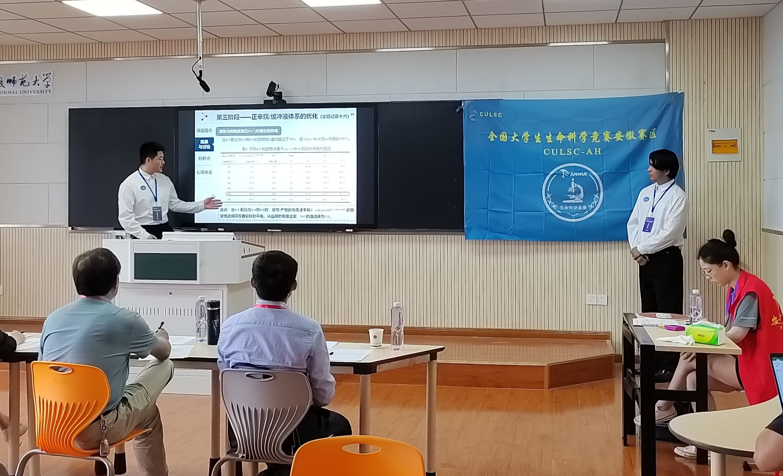 7月13日下午4点,大赛闭幕式举行。经专家评委选出来自蚌埠医科大学和安徽工程大学两所学校的代表队进行现场答辩展示。两队选手进行了PPT汇报陈述,并流畅回答了专家们的提问。