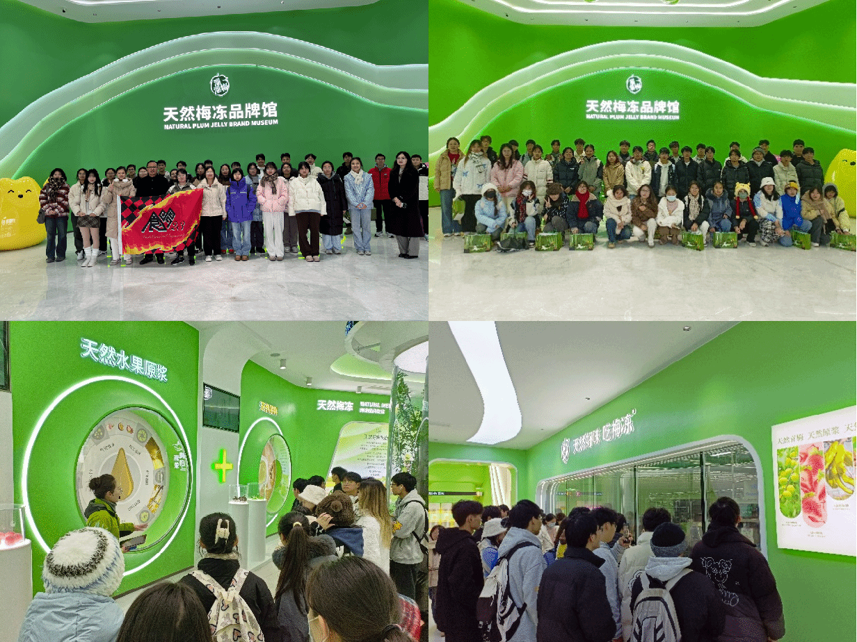 在溜溜果园梅冻食品科技工厂,同学们详细地了解了溜溜果园股份有限公司的发展历史、特色产品和自动化生产设备,特别是国外引进的全自动化梅冻生产线,实现了产品从打浆到成品包装全自动化高效生产,展示了传统食品与现代食品科技的有机结合,创新活力十足。