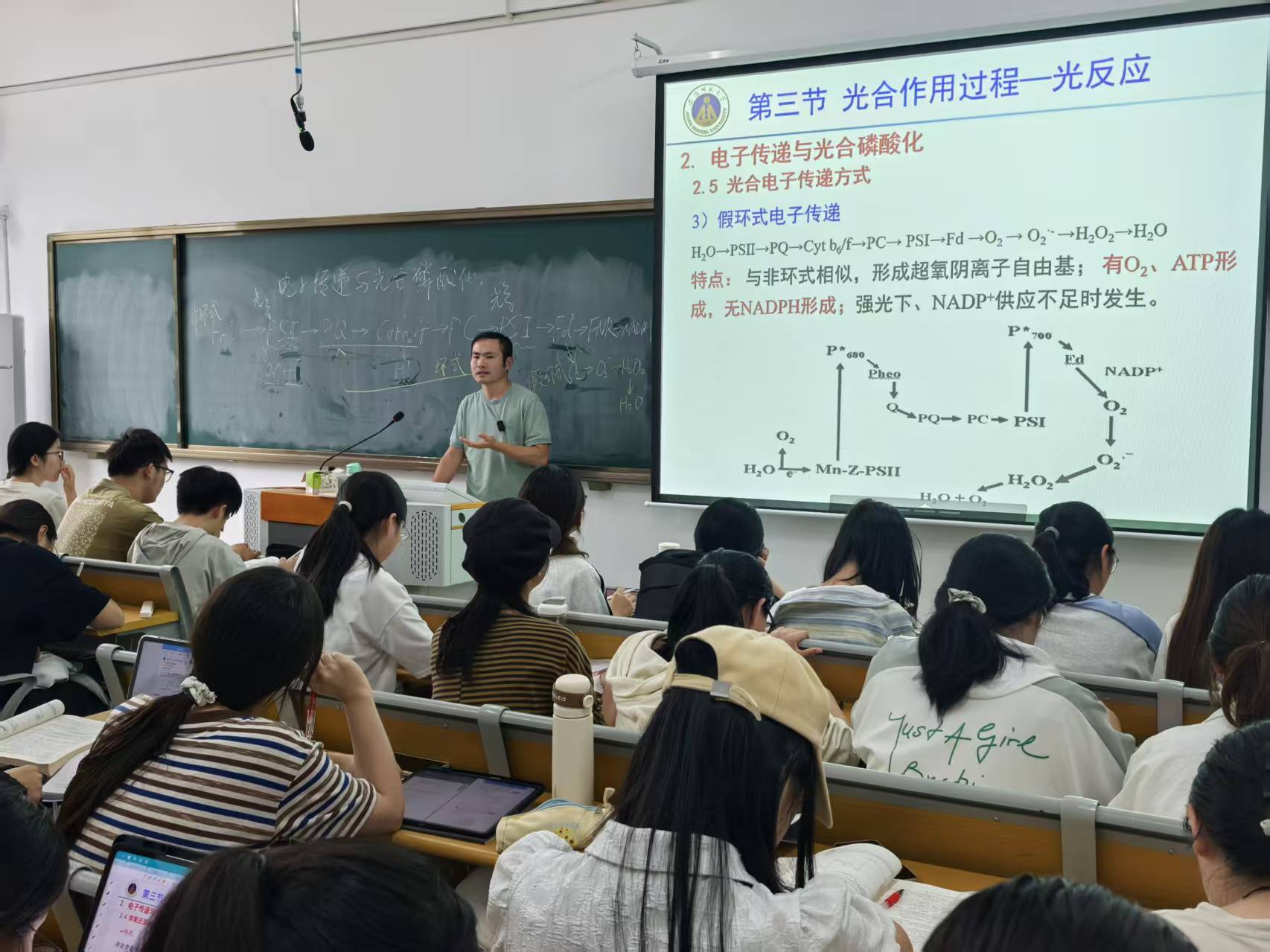 本节公开课的授课内容为“植物的光合作用——电子传递和光合磷酸化”。在新课开始前,张亚简单回顾了光合作用的原初反应过程,然后通过科学家发现红降和双光增益效应引入新课。在讲课中,张亚条理清晰地讲解了光合作用中电子传递过程及光合链中两个光系统的结构,并重点讲解了两个光系统的功能差别以及光合磷酸化的相关学说。同时,张亚结合板书帮助学生厘清光合作用中三种光合链的具体途径和特征差异,加强学生理解光反应中相关能量的转变过程。授课内容适时联系最新的科研论文,以最新科研成果反哺教学。教学过程中,张亚使用了“雨课堂”,增强了师生的互动感。