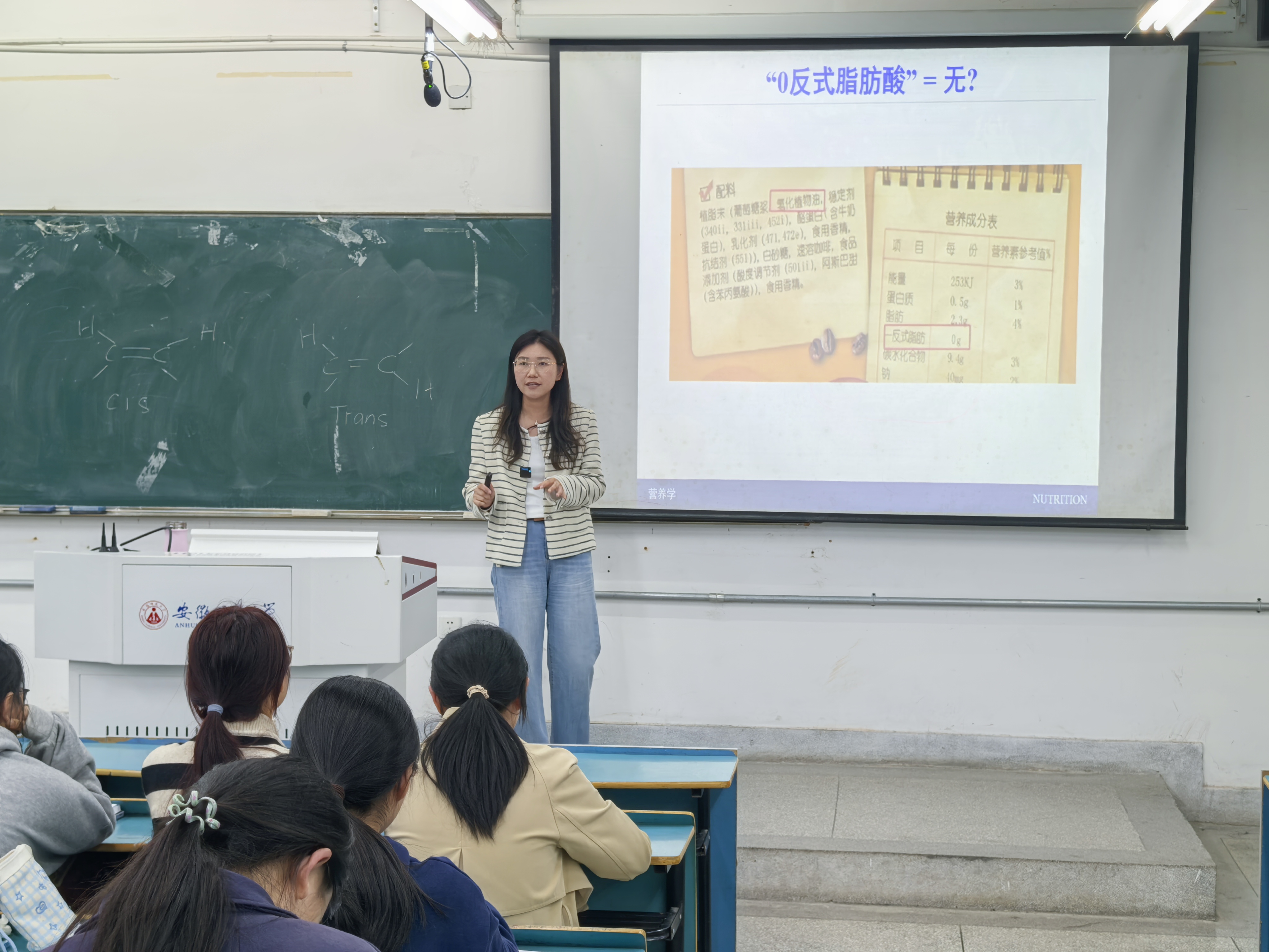 本次示范课围绕《营养学》中“反式脂肪酸”相关内容展开,以“脂肪的摄取与食物来源”为主题,聚焦“食物中的反式脂肪酸为何备受关注”这一核心问题,引导学生深入探讨脂肪摄入与健康之间的关系。课堂从“幼儿因食用植物奶油蛋糕引发家长担忧”的社会热点事件切入,激发学生对食品安全与营养科学关系的思考。严帆借助生动案例与科学分析,阐释了顺式与反式脂肪酸在空间构型上的细微差异如何导致代谢效应显著不同,帮助学生理解“结构决定功能”这一生命科学核心思想。课程结合《中国居民膳食指南(2022)》及相关研究数据,系统讲解了脂肪酸的分类、代谢途径及其健康影响。通过“脂肪木马”的比喻和食物标签实例分析,学生进一步认识到反式脂肪酸对心血管、代谢及神经系统的危害,并掌握了科学解读食品营养成分表的方法。课程最后,严帆回归主题,引导学生树立“少油、选好油、合理搭配”的健康饮食观念。