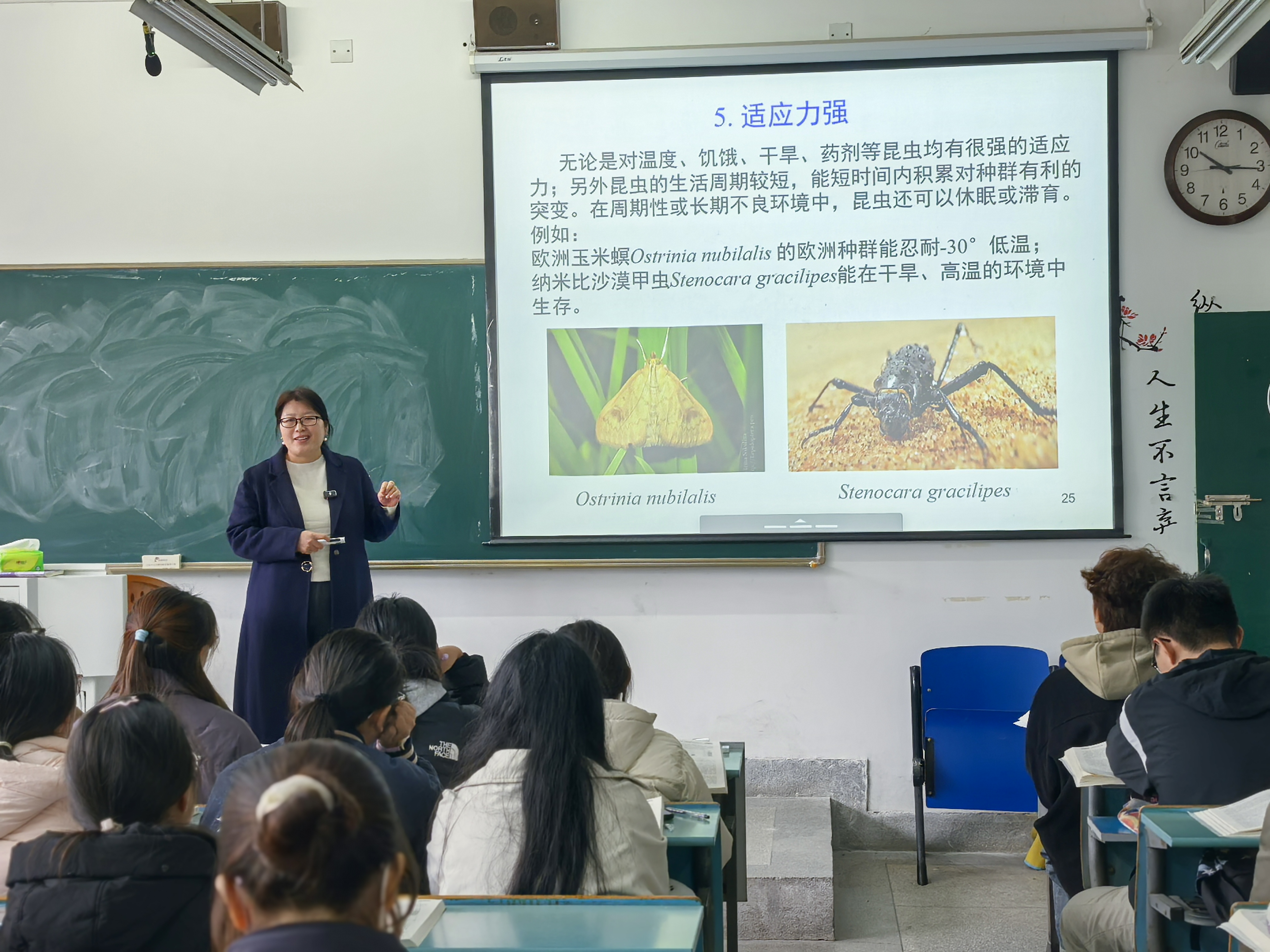 本次示范公开课的授课内容是节肢动物门“昆虫纲”。聂瑞娥围绕昆虫释义、系统地位、形态特征到昆虫纲繁盛的特点及其原因、及昆虫与人类的关系这一教学主线,系统讲解了昆虫的基本结构,重点讲述了昆虫纲繁盛的特点、原因及与人类的关系。将昆虫学领域的前沿研究和自己的研究成果融入基础知识讲解中,帮助同学们构建关于昆虫识别、多样性及生态角色的知识框架,拓宽学生对昆虫认识的纬度和学术视野,提升了知识深度与思维层次。