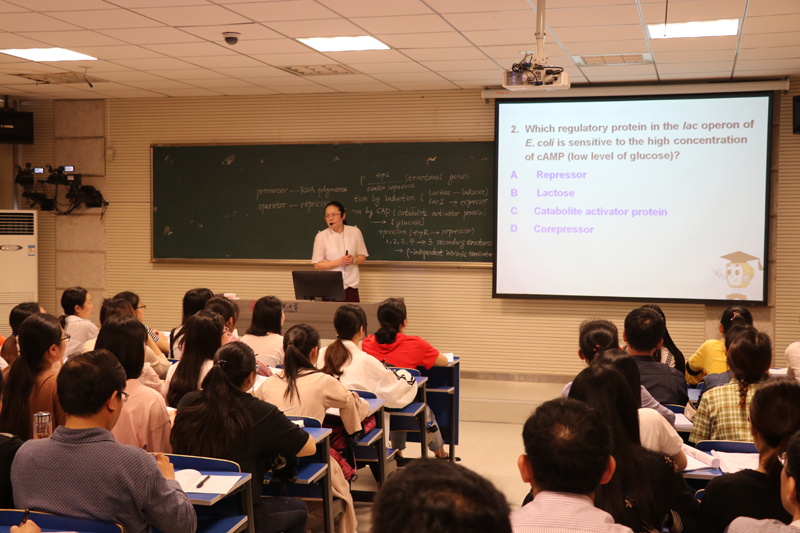 此次公开课的教学内容是“真核生物基因表达的调控”,该部分内容是“现代分子生物学”双语课程的核心章节。朱国萍老师首先系统的回顾和总结了上节课的主要内容,通过习题练习的方式加深了学生对关键内容的理解,并自然引入新课。朱老师结合真核生物基因组的特征,详细描述了真核生物基因表达调控的特点。同时,朱老师结合自己最新科研成果,生动有趣的告诉同学们,原核生物中也存在类似真核生物的基因表达调控现象,以此来让学生明白,生命科学是一个不断发展完善的学科,同时,也通过这种方式让学生把枯燥知识“活化”。