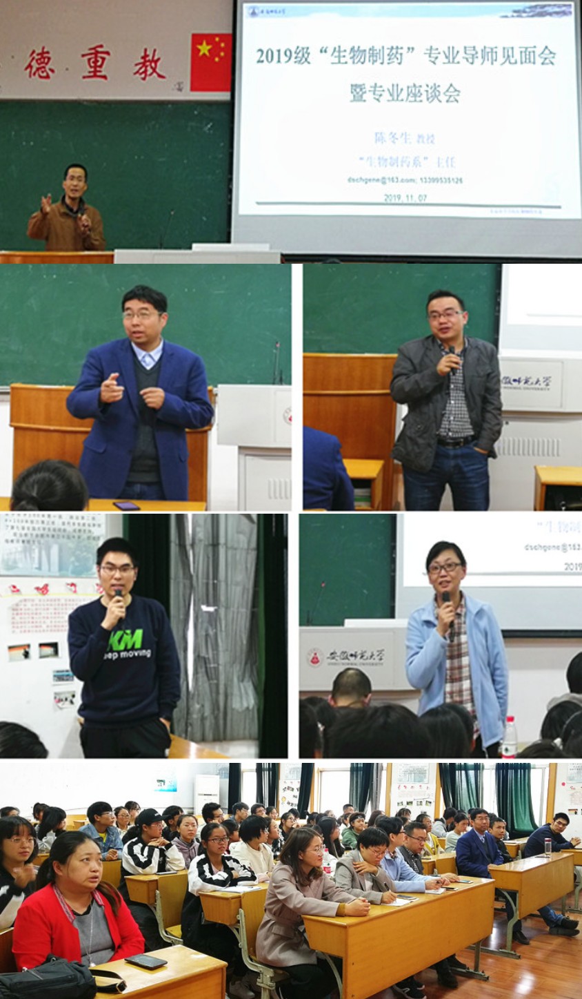 座谈会伊始,陈冬生老师首先介绍出席会议的各位专业教师,公布本科生导师分配名单。随后,陈老师围绕“为何上大学”、“何谓大学”、“如何认识生物制药专业”及“大学如何度过”四个方面展开话题。陈老师晓之以理,动之以情的话语解开了同学们内心一些共同的疑团,理清了未来发展的思路,大家感觉眼前豁然开朗。随后阚显照、沈小鹏、李明会、钱叶雄和孙庆艳等老师从珍惜大学时光立志成才、做好人生阶段性选择、考研必要性、合理规划大学时光和英语的重要性等方面,发表了热情洋溢的讲话,对广大新生提出了谆谆的教诲和要求。老师们一致希望同学们:(1)珍惜大学时光,合理规划好大学学习和生活。(2)勤奋努力,学好专业理论知识。(3)全面提升各方面的能力,做到知识与能力并重,立志成人成才。同学们以热烈的掌声献给可亲可敬的老师们。