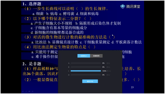 本节课的主题是“微生物的生长规律”,主要包括单细胞微生物的典型生长曲线和微生物的连续培养。谭老师利用腾讯课堂线上教学手段,以选择题和判断题等客观题型快速检查和复习上一节课的内容,导入新课。