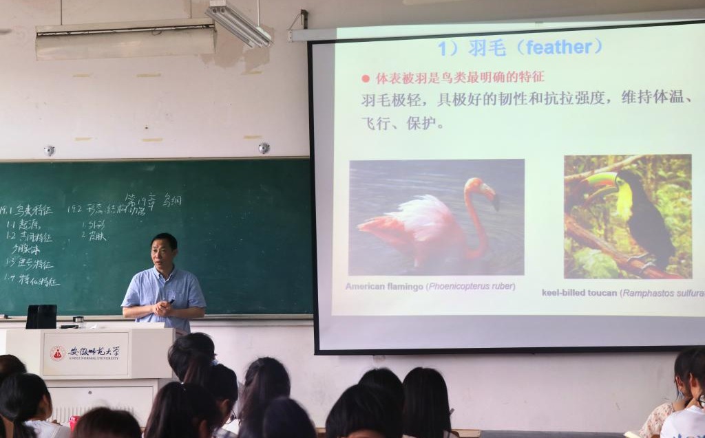 张方首先从鸟类起源入手,解析了“鸟类起源于爬行动物”的科学依据。在讲述中融入思政元素,介绍了我国科技工作者在鸟类起源研究工作中的杰出贡献。接下来,他从鸟类与爬行动物的共同特征、鸟类的进化特征及其适应飞翔生活等方面全面阐述了鸟类的主要特征。在鸟类形态、结构和功能等重点教学内容中,充分联系前后章节相关的知识点,注重融合贯通,例如比对介绍鸟类和两栖类的瞬膜位置和功能的差异,从进化起源角度阐述了鱼类鳞片和鸟类鳞片的不同。