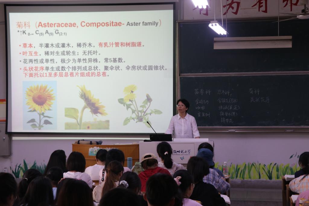 师雪芹首先重点讲解了菊科植物的一般特征及其分类。授课中充分联系前面章节的相关内容,建立系统的知识构架,并达到融会贯通。同时,授课过程融入思政元素。如讲到黄花蒿的时候,介绍了我国诺贝尔生理学或医学奖获得者屠呦呦教授从中药古籍文献中获得灵感,进而发现青蒿素的故事。随后从药用、观赏、入侵植物等方面阐述了菊科植物与人类生活的关系。最后从植物的结构和繁殖方面解析了菊科成为现今被子植物第一大科的原因。