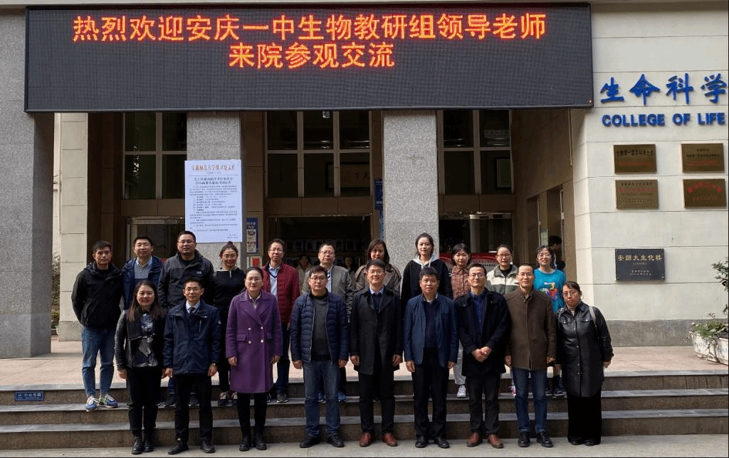 本网讯(生科院 苗素丽)11月12日下午,安庆一中教科室副主任徐承恩和生物教研组长朱晨兵带领生物教研组教师章霞云、朱俊辉、李燕、王静、彭萍芳、邹凯、陈张进、崔丽、潘慧君一行共计11人,来学院进行参观交流。生科院党委书记蒋学波、副院长陈冬生和王立龙、生物科学专业负责人杨安娜、实验中心主任曹正宇、学院教师韩菲、闫浩和卢存龙等参会交流,会议由蒋学波主持。