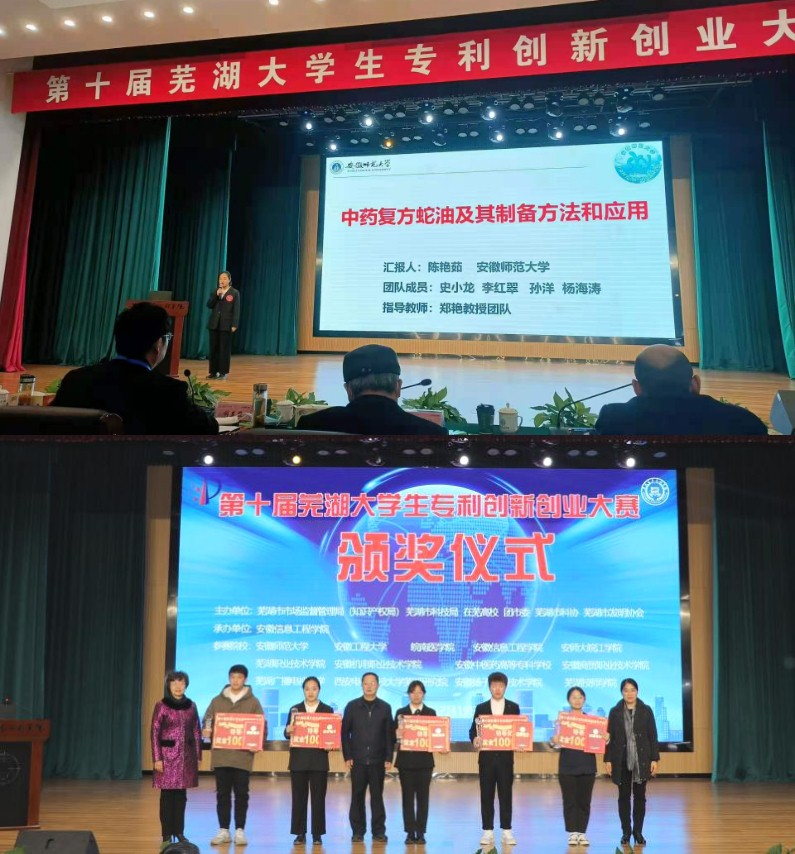本网讯(生科院 王源秀)在刚结束的第十届芜湖市大学生专利创新创业大赛中,我院郑艳教授团队指导的专利作品“中药复方蛇油及其制备方法和应用”从774件作品中脱颖而出,斩获大赛“特等奖”(全市共5个)。之前,该作品在bwin必赢线路检测专利大赛中亦荣获校级“特等奖”。
