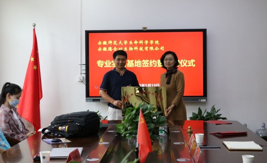 5月19日下午,安徽德合功生物科技有限公司董事长张权庚和总经理童永贵一行来到生科院,就专业实习基地、校企合作等事项进行洽谈,并签署了专业实习协议。签约仪式在赭山校区生化楼第一会议室举行,副书记汪倩倩、副院长陈冬生出席本次签约仪式。