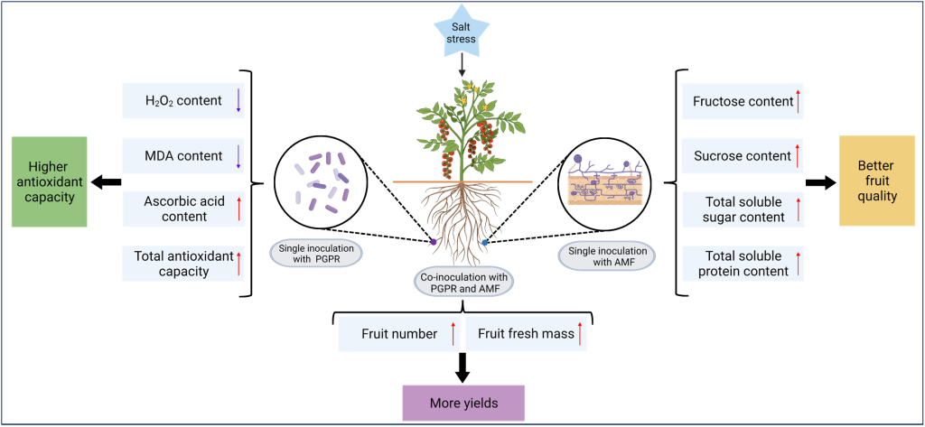 图2. 低盐胁迫下丛枝菌根真菌和枯草芽孢杆菌对番茄耐盐性的调节机制