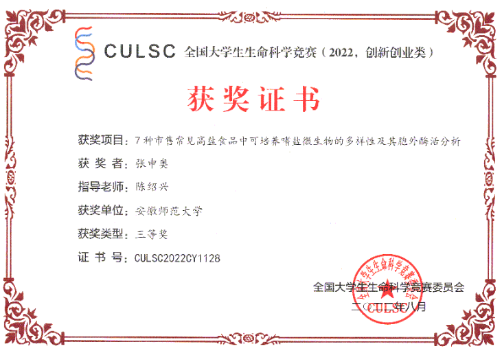 张申奥同学在大一入学不久就主动申请进入陈绍兴老师实验室从事极端高盐环境微生物资源调查与发掘的科研工作,先后主持毕业论文“优培”计划项目和国家级大学生创新创业项目。以这些项目成果为基础,参加学科竞赛先后荣获全国大学生生命科学竞赛(2022,科学探究类)三等奖、全国大学生生命科学竞赛(2022,创新创业类)三等奖(图2)、bwin必赢线路检测第十届科研论文大赛三等奖。