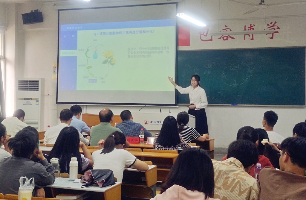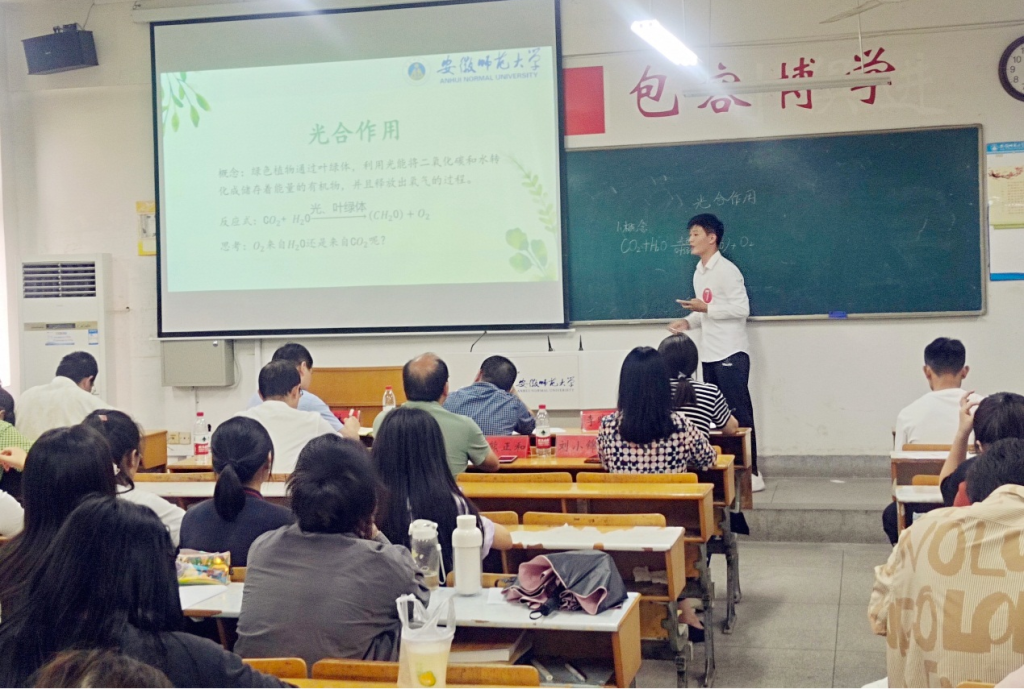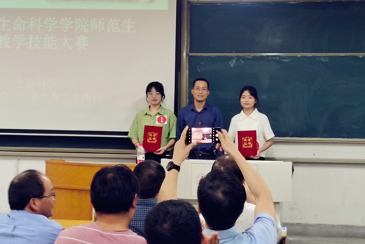 比赛分两个分赛场进行,参赛选手们将高中生物知识与自身教学技能融为一体,通过ppt展示、教具模拟、板书设计等方面展示了自己的专业能力。比赛过程中,教学内容重点难点突出,教学思路清晰科学,时间安排合理,教态自然,语调亲切,给评委和观众们留下了深刻的印象,赢得阵阵掌声。最终,2020级生物科学专业时蕴希、周奂斩获了本次比赛的一等奖,储亚飞、冯汇星等四人获得了二等奖,谢雨宁、倪惠等八人获得了三等奖。
