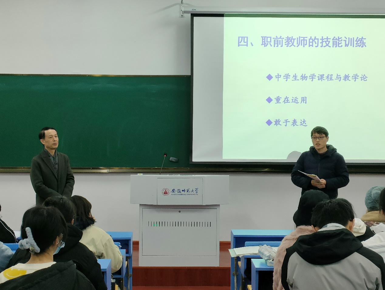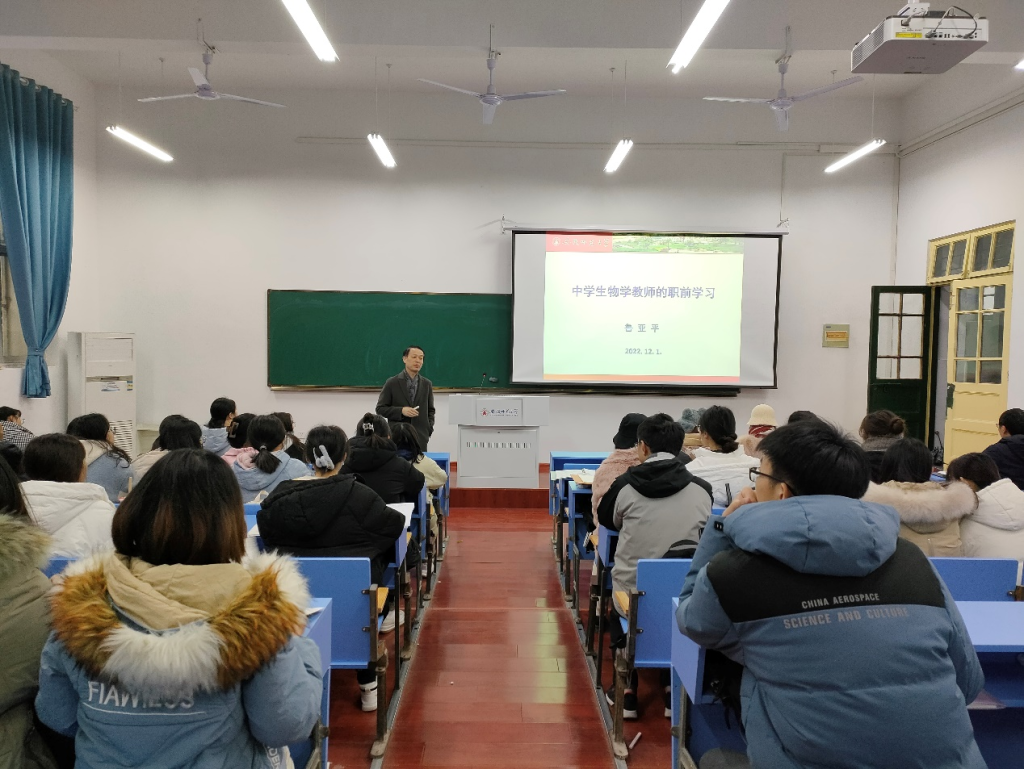 本网讯(生科院 刘雨涵)为增进师范生对卓越教师培养计划的认识,打好专业基础,明确专业学习的思路,12月1日下午在教学楼1108教室,学院邀请鲁亚平教授为2021级与2022级生物科学卓越教师班(师范)开展“中学生物教师的职前学习”主题讲座。本次讲座由生物科学(师范)卓越教师班专业负责人姜斌主持。