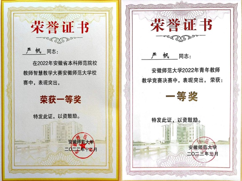 在院级和校级比赛中,严帆老师教学内容重点突出、条理清楚,教学组织安排合理、讲解清晰,教态仪表自然得体、精神饱满,板书设计与教学内容紧密联系,受到比赛评委们的一致肯定。经过激烈角逐,严帆老师最终获得院级青年教师教学基本功比赛“一等奖”,校级青年教师教学竞赛和校级智慧教学竞赛均荣获“一等奖”。