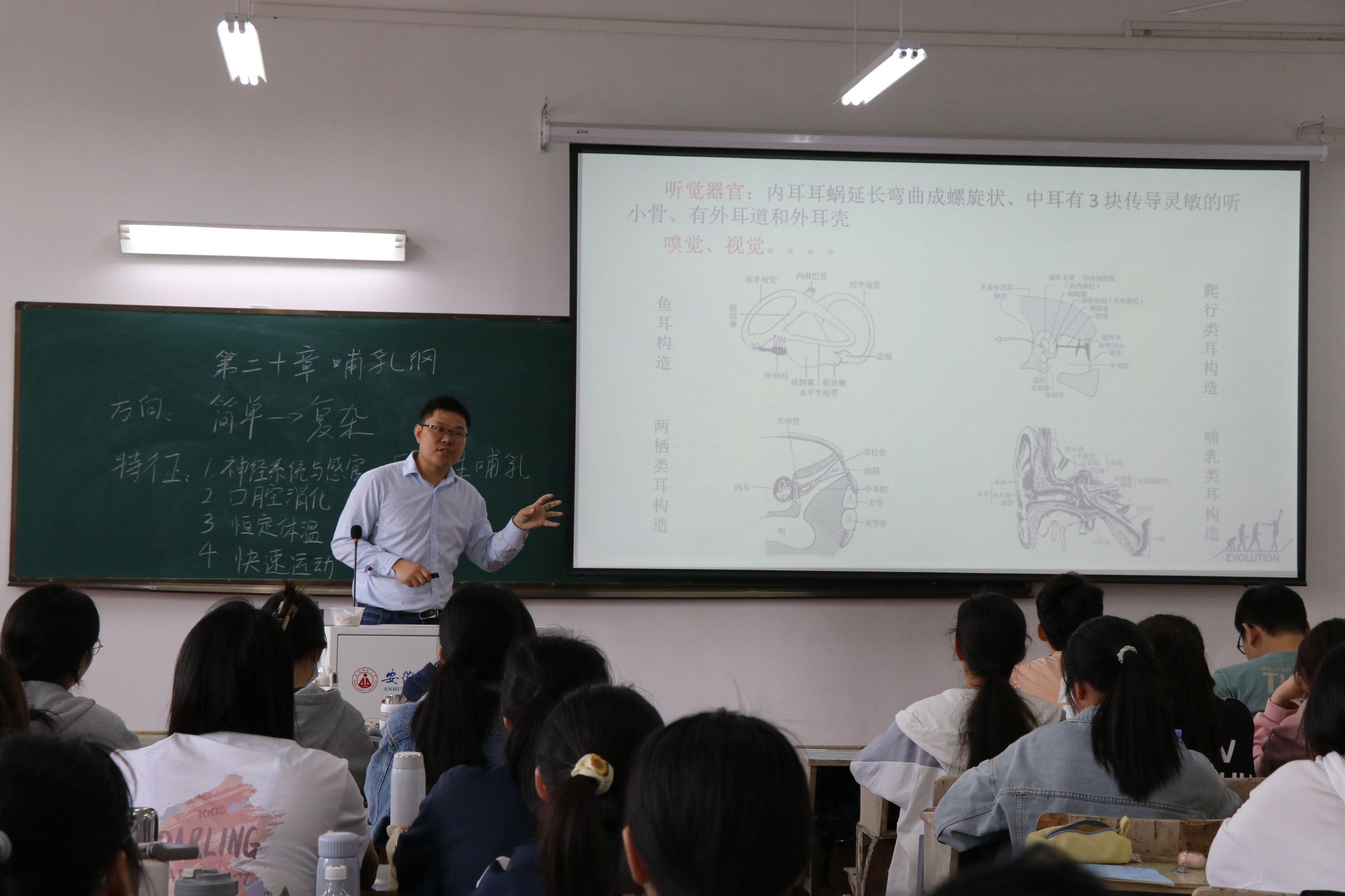 本次公开课的内容为“哺乳纲的主要特征”,潘老师从脊椎动物系统演化的角度,结合视频,对哺乳纲的形态、结构、功能、进化等整个知识框架体系进行了系统介绍,为后续哺乳纲的分类学习奠定基础。潘老师首先通过一段视频“脊椎动物的演化进程”导入新课内容,上课伊始便牢牢抓住听课者的注意力。接下来,讲授了脊椎动物的繁殖方式及哺乳特点,介绍了哺乳动物在繁殖能量投入和生存方面的博弈。并结合自己的科学研究对象——扬子鳄,将哺乳动物与爬行动物的生殖进行对比分析。授课过程中,潘老师播放了雪豹捕食的视频,画面中雪豹为了种群生存与繁衍而勇猛向前。此处适时地引入课程思政,激励同学们为实现理想而勇往直前,不要停止努力的脚步。整节课中,潘老师以进化为主线,融入脊椎动物研究最新发展动态,理论联系实践,同学们兴趣浓厚,课堂教学效果良好。