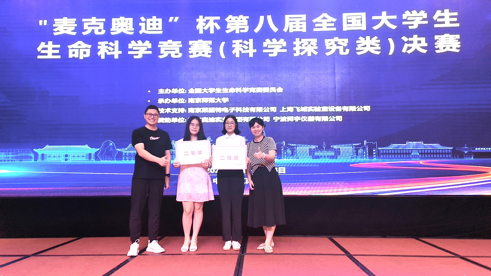 本网讯(生科院 王旭)8月18日上午,第八届全国大学生生命科学竞赛(科学探究类)决赛圆满落幕。本次决赛由全国大学生生命科学竞赛委员会主办,南京师范大学承办。共有全国76 所高校参加,其中,线下参赛项目 194 项、线上参赛项目 114 项。